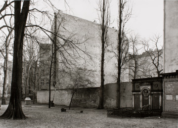A graveyard with a small number of headstones is separated from a street of apartment buildings by a brick and concrete wall. Neutral gray light bathing the scene and the large, empty side of a building situated at the center contribute to a sense of starkness. In 1991, two years after German reunification, Thomas Struth began to photograph architectural sites in the former East Germany, previously inaccessible from the West. Much of the architecture he encountered had suffered from neglect under Communist rule after World War II (1939–1945). In discovering this older graveyard, tucked away from the grid of the streets in the middle of the city, he communicated something of the complexity of the built environment and the layered history of Berlin itself.