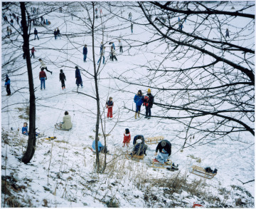 In this image Joachim Brohm explores the intimacies of social experience as they take place in the natural landscape, in a way reminiscent of the scenes of daily life by the 17th-century Netherlandish painter Pieter Brueghel. Brohm's decision to utilize color and to include people in his landscapes sets his work apart from the sober and monochromatic appearance of photographs by his German contemporaries.