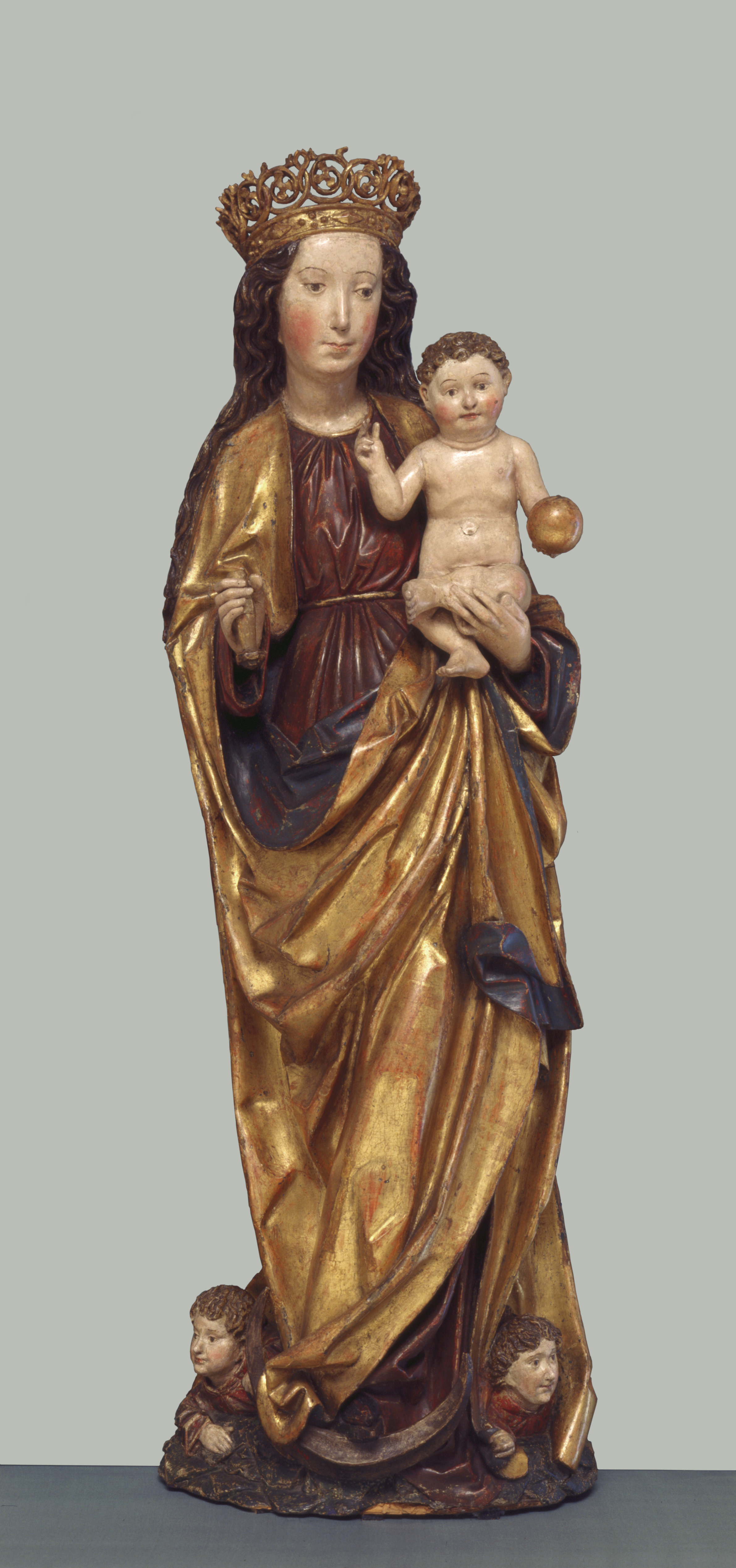 As the interest and devotion to the Virgin Mary intensified after the 13th century, representations of her took many forms. Images based on the Book of Revelation were intended to emphasize her purity and triumph over sin. This figure of the Virgin Mary, robed in gold and standing on a crescent moon, was inspired by Revelation (12:1): “And a great portent appeared in heaven, a woman clothed with the sun, with the moon under her feet…”