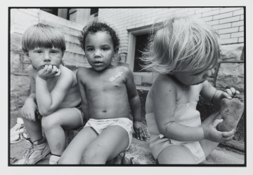 In this photograph of three young children, seated next to each other, artist Anna Kuperberg illustrates three different expressions of childhood curiosity. The child on the left stares out at the photographer. His chin rests on his palm, his elbow rests on his knee, with fingers curled around his mouth, in a position typical of thinking. He seems to be openly curious and pondering deeply all that is happening in front of him. The child in the center also looks directly at the photographer, leaning back on one arm for support, curious, but a bit hesitant about what is taking place. The third child ignores the photographer, and what is going on entirely, and is completely absorbed in studying a bare foot. This photograph reveals Kuperberg's ability to capture children on their own terms.
