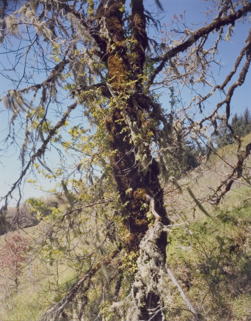 In this photograph the spindly limbs and Spanish moss of an aged oak tree in a pasture are enlivened by bright sunlight and swirling gusts of wind. Karen Halverson has called this image her "whirling dervish." It is one of many stunning large-scale color images of trees in the American West created by the artist, which she considers to be intimate portraits. In focusing intently on form, texture, and color, Halverson conveys a vibrant sense of individual character.
