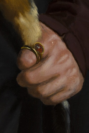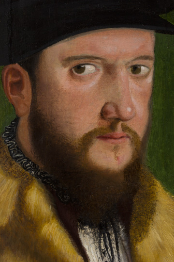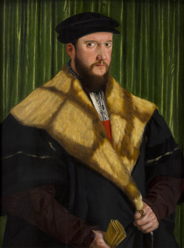 The identity of this subject is unknown. Although the man’s ring bears a monogram, no name has been associated with the initials. His fur garment and the gloves he holds attest to his prosperity. Hans Mielich, a leading Munich painter of the early 16th century, rarely infused a sense of individual personality into his portraits. Here, however, viewers can sense the man’s apprehension as he faces his chronicler. This uneasiness is illustrated by his firm grip on the edge of his coat and his cautious glance out toward the viewer.