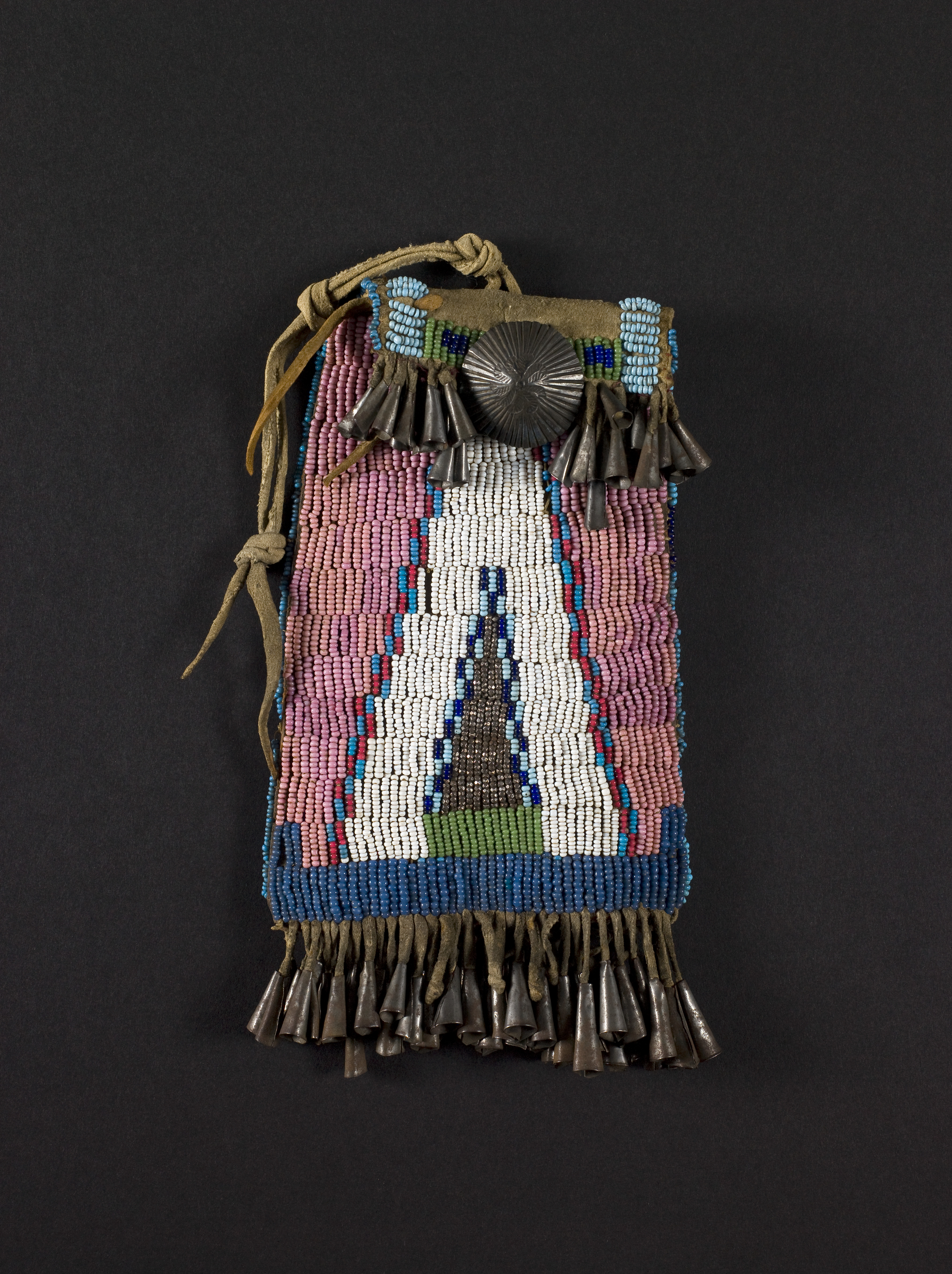 This finely beaded bag, with its bold patterns of triangles, is finished with tin cones and a silver button. The elaborate decoration reflects the artists’ great attention to detail and their deep understanding of form, proportion, and balance.