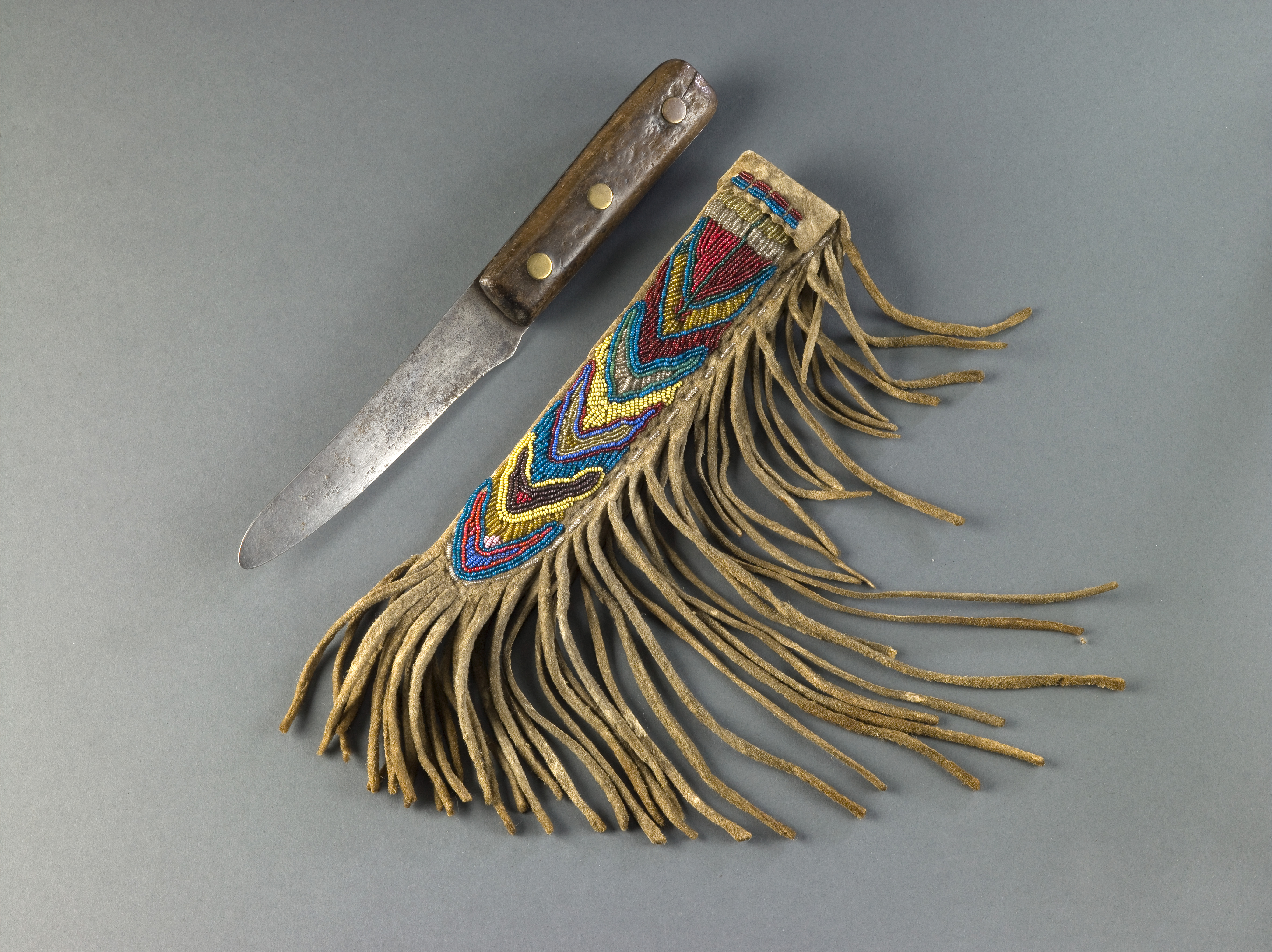 Extensive beadwork transforms this knife case from utilitarian object into an elegant work of art. Plains men often wear their knives tied to their belts, and a knife case is not merely a necessary cover, but a means of personal adornment. The shape of the case is determined by the type of knife it protects. Single-edged blades are stored in cases with one straight and one curved edge, while double-edged blades are housed in symmetrical cases.