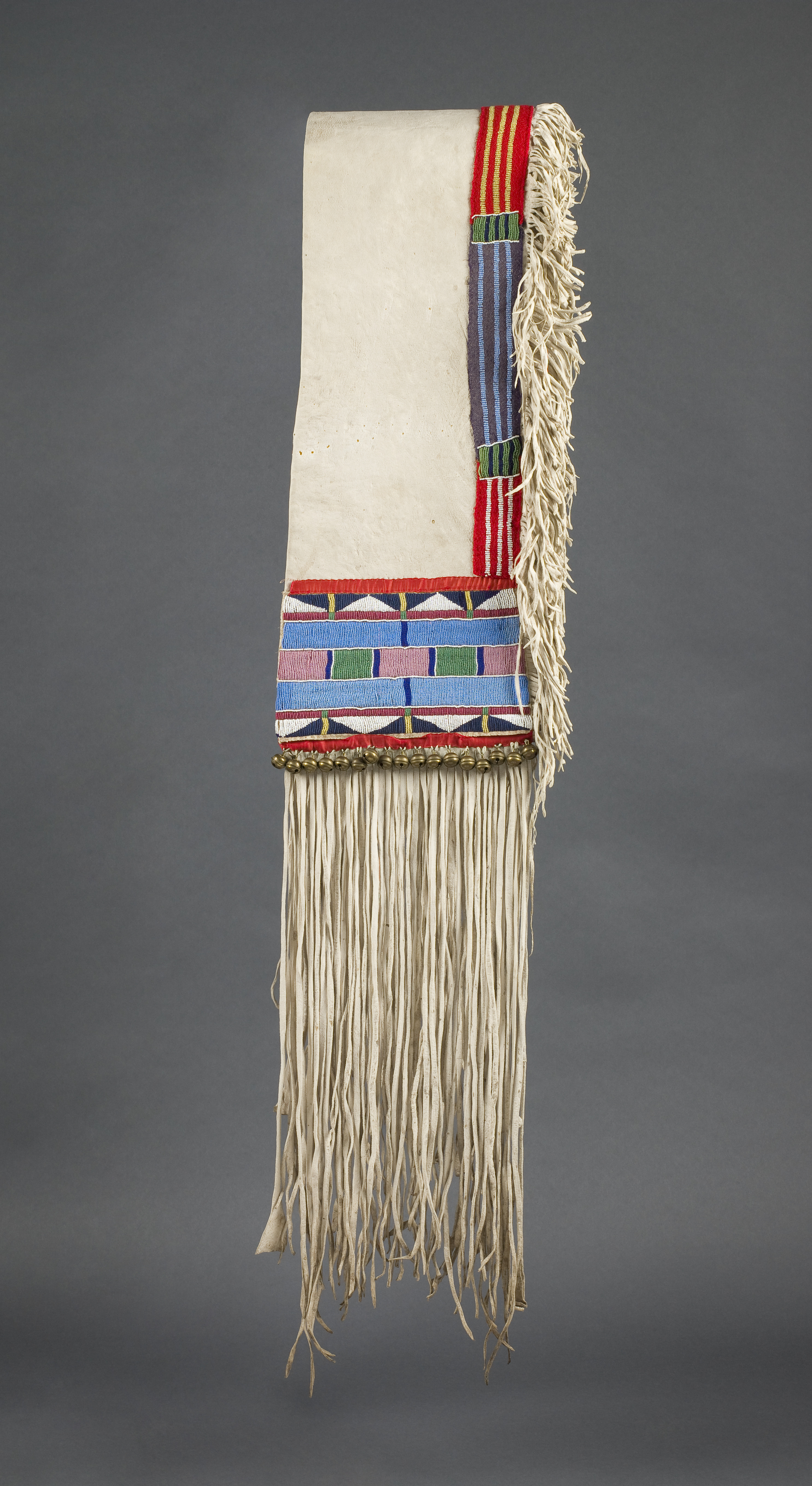 Pausing only to spend the cold season near a river that supplied water and nearby trees for wood, nomadic Plains tribes followed the buffalo from year to year. Many storage containers were created to carry personal possessions during traveling season. Saddlebags like this one were thrown over the horse or loaded in the travois, a triangle-shaped frame that was dragged behind the horse. The lower portions of the bags were sealed and items packed through a long slit in the side. They were decorated in Plains Indian fashion with glass beads, long fringe that swayed as the horse moved, and small brass bells that made a pleasant sound when the horse walked.