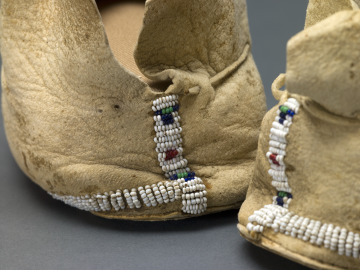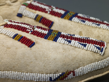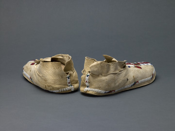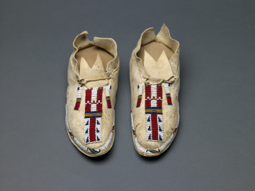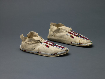Distinctive moccasin styles reflect the wide variety of decorative techniques that exist within Plains communities. Each pair of moccasins contains visual cues that communicate ties to kin, community and the wider cosmos. These moccasins present intriguing Inunaina (Arapaho)-style designs that are believed to illustrate precise meanings. The central line represents the individual path of the wearer, and the two vertical lines connected by a horizontal stripe in the center signifies the individual’s connection to buffalo paths and future success in life.