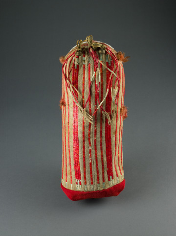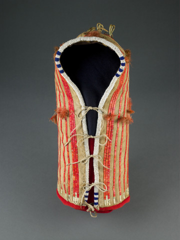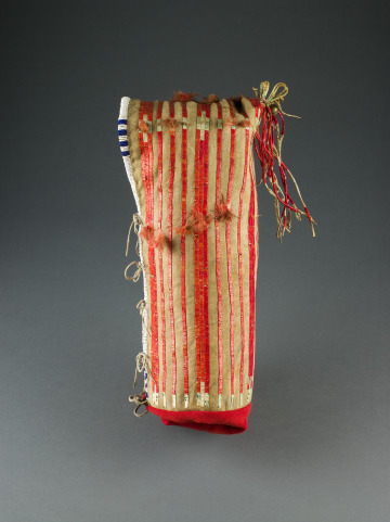 The red decoration on this toy cradle is made from porcupine quills, part of a rich Plains artistic tradition filled with cultural and symbolic meaning. Quillwork decoration, still practiced today, predates beadwork and often provides inspiration for later bead designs. Quills are softened with water, dyed with berries, roots, and plants, and then tightly wrapped and stitched or plaited onto hides to create visually powerful patterns.
