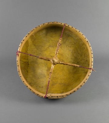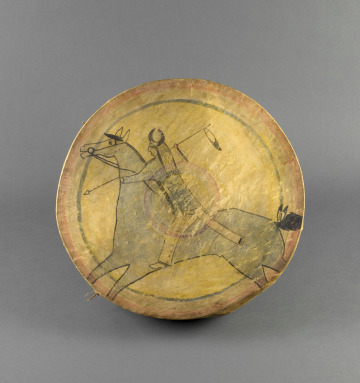 Made for trade during the reservation era, this drum demonstrates how Plains men adapted ancestral pictorial conventions to earn income under foreign economic and social contexts.