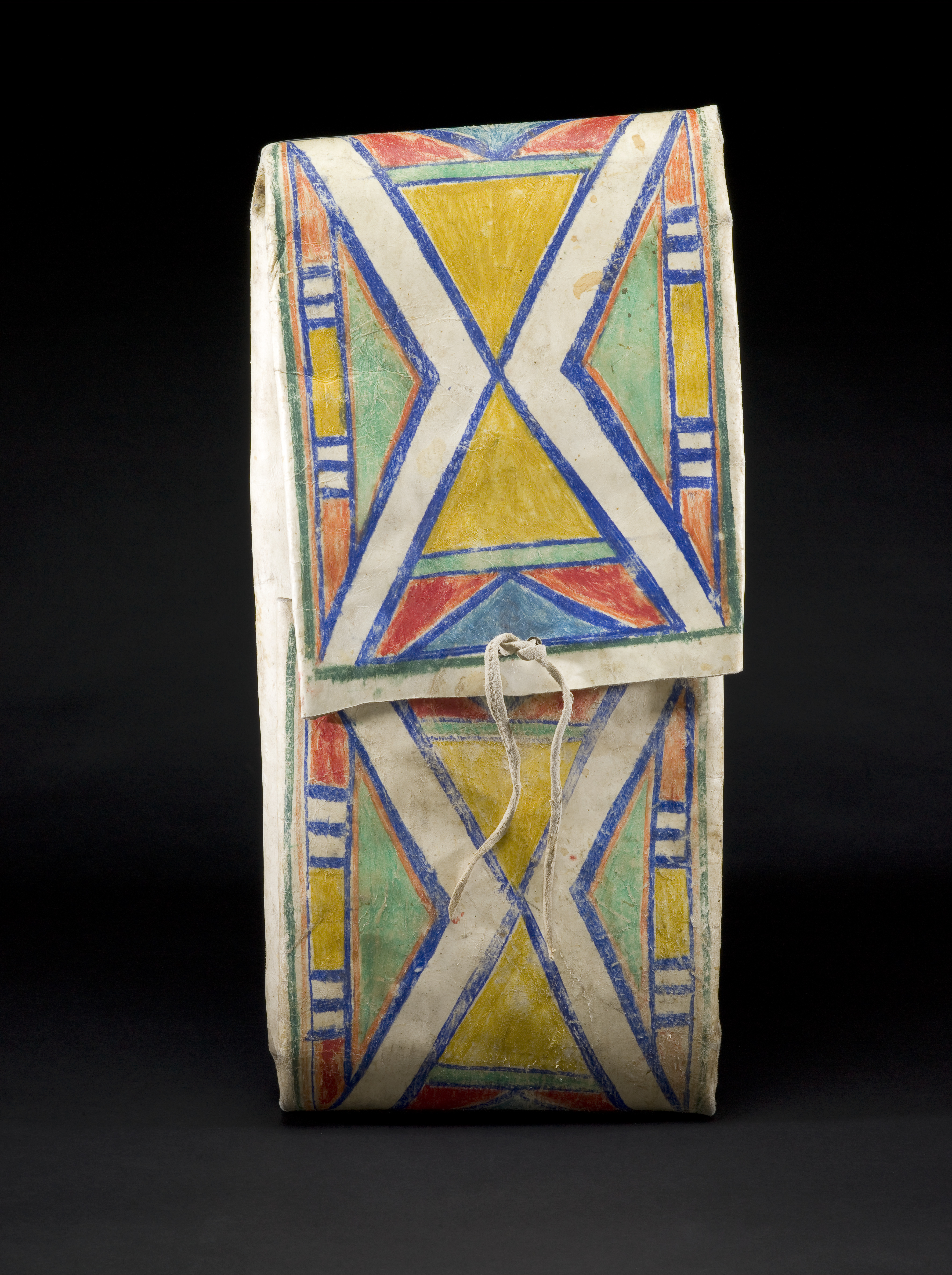 She painted the flat, stretched hide in specific sections that, when folded to form the envelope here, appear solely on the front-facing panels. The painted sections align to create a diamond that extends across the central opening.