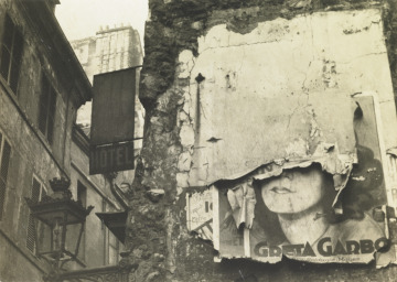 With her camera pointed upward from the narrow street, Ilse Bing captured this view of Parisian buildings and signage. Her image reveals an engaging intersection of different geometric planes. Additionally, the lilting poster on a crumbling wall obscuring Greta Garbo’s eyes makes this an oddly enigmatic image, reflecting early 20th-century Surrealism’s emphasis on dreamlike scenarios. Bing represented a newer generation of photographers in the early 20th century who adopted smaller portable cameras to explore their environments and uncover unexpected details. She was one of the first to use a Leica 35mm camera, and—unfettered by tripods and negative holders—she generated innovative compositions for both private and commercial purposes.
