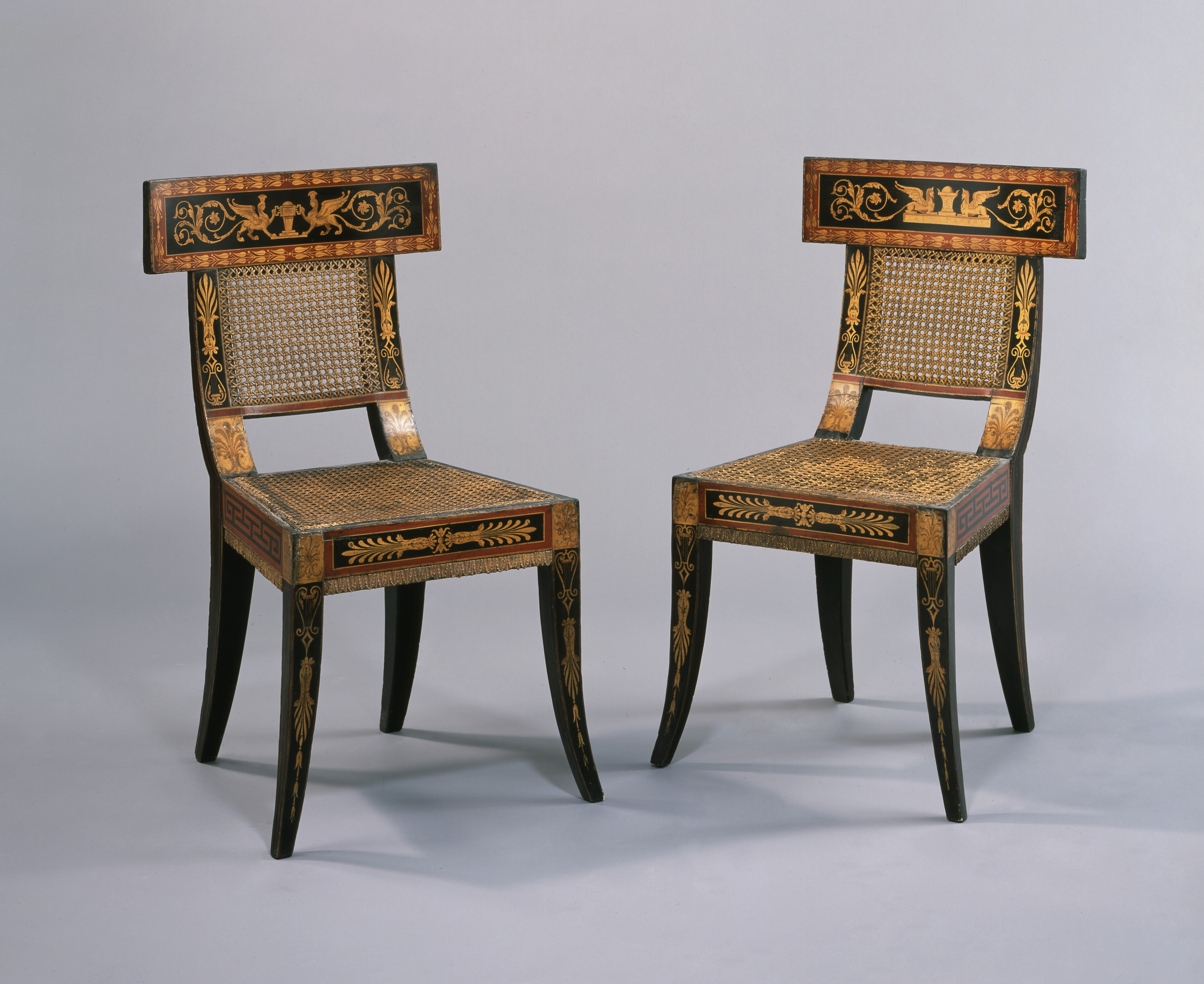 Dramatically curved and boldly colored, these chairs heralded a new style of classicism in American furniture that turned to ancient Greek forms for its models. The chairs are from a large suite of tables and seating furniture by the English architect Benjamin Henry Latrobe for the drawing room of the house he designed for the Philadelphia merchant William Waln. The simplified palette of red, black, and gold provides clarity and contrast for the classical vocabulary of gilded palmettes, lyres, and foliage that adorn the chairs' surfaces. Each crest rail in the set of chairs features a different composition of mythological creatures. Latrobe's innovative design presented a challenge for the furniture maker he commissioned to make the set. Writing to his client, Latrobe complained that the first model "was the ugliest thing I ever saw. To make a chair requires as much taste as to design one."