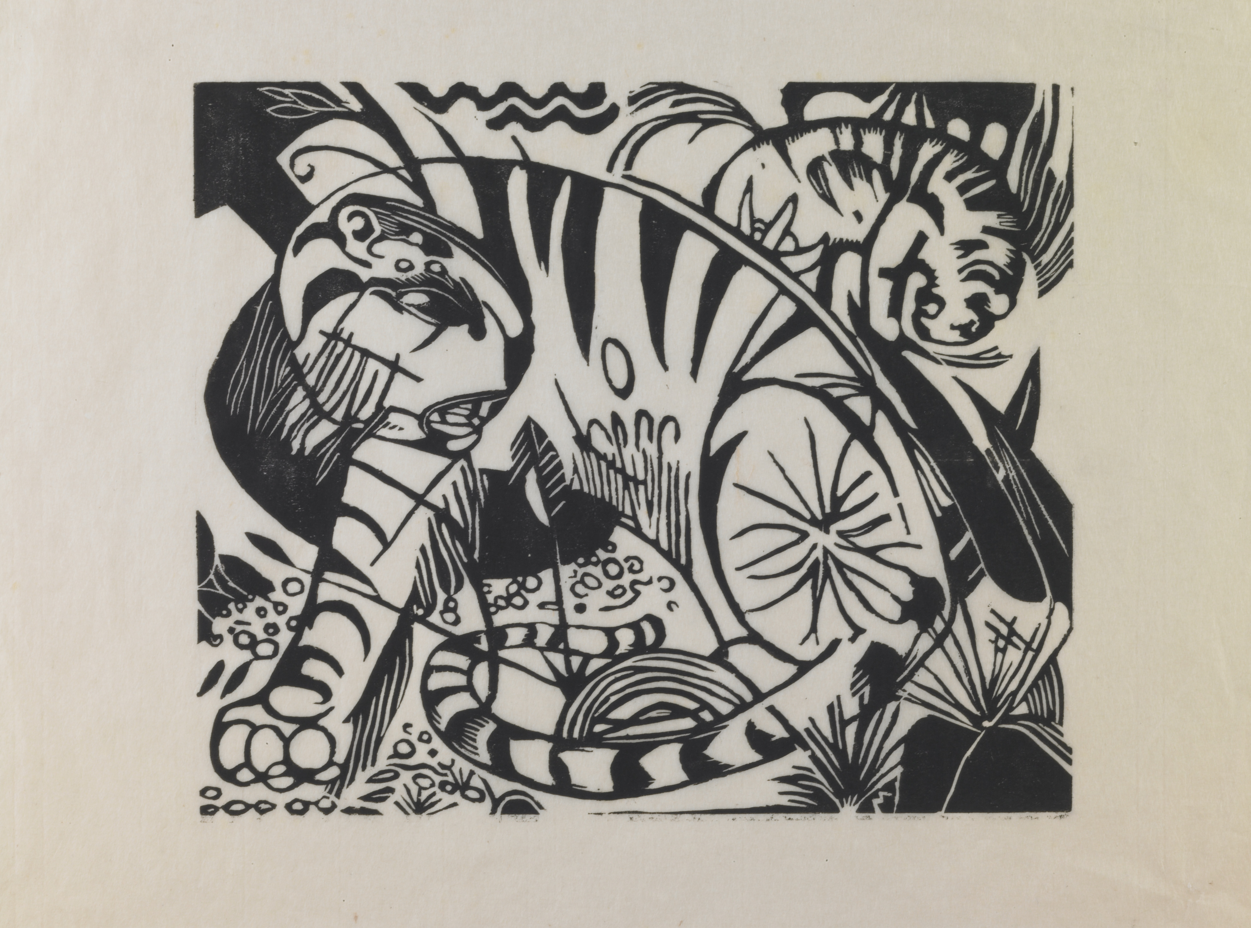 This rare woodblock print comes from one of the most important moments of Franz Marc's short career after he encountered French Cubism and Futurism. The crouching tigers in tropical vegetation are conceived through bold forceful lines and simplified rhythmic shapes. Marc used a vocabulary that was non-naturalistic in an attempt to depict the essence and spirit of the animals and to show them in unity with their natural surroundings. He ascribed a spiritual purity to wild animals that he found lacking in man.