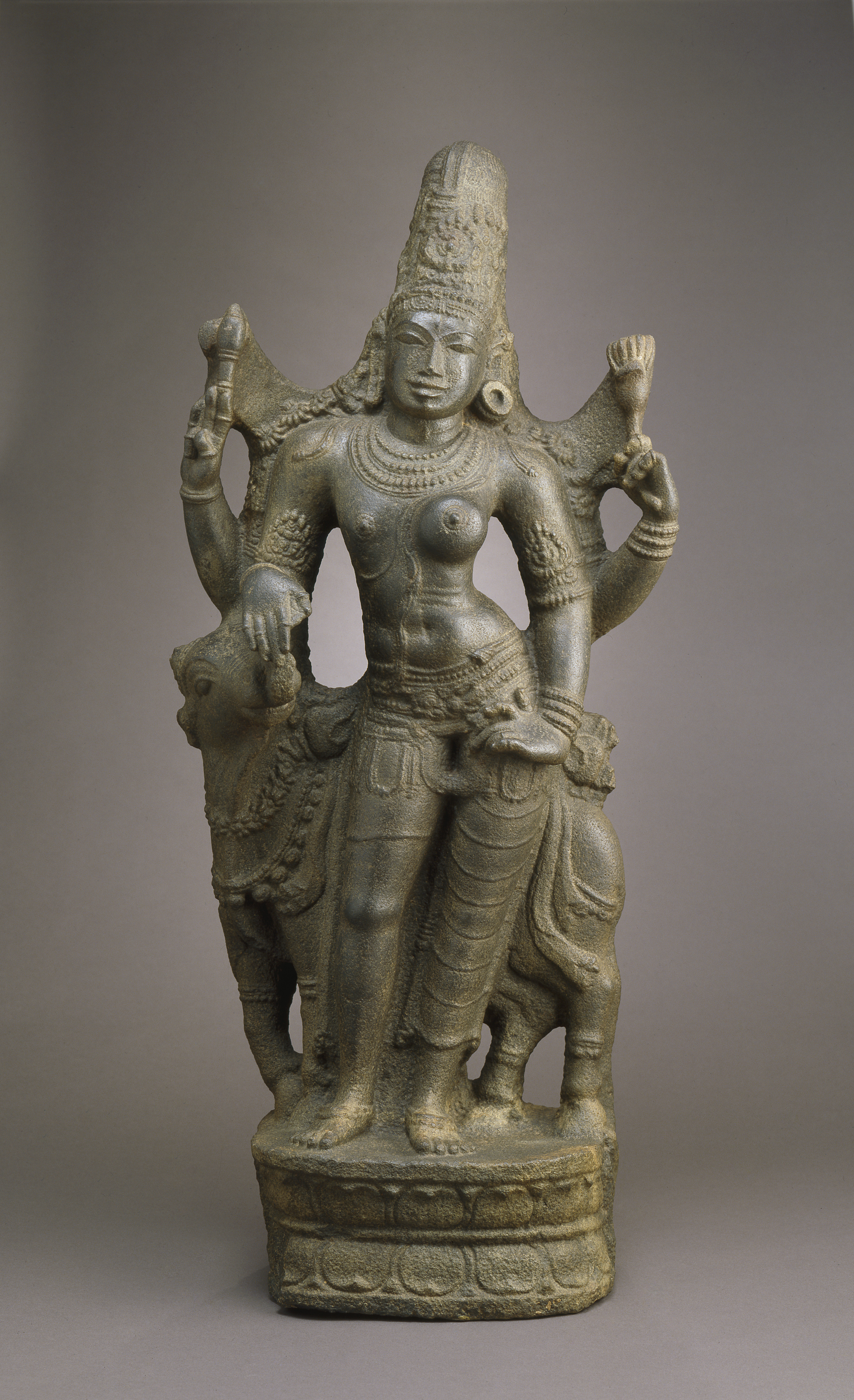This compelling combination of male and female forms depicts the Hindu god known as Ardhanarisvara, the Lord who is Half Woman. In this aspect, the male Siva has joined with his wife Uma (Parvati) in an expression of the unification of dualistic oppositions such as consciousness versus form or eternity versus change. The male side of this figure raises a battle-ax and rests his forearm on the muzzle of his attendant bull, Nandi. The female side bears a lotus flower and contrasts with the masculine half through different jewelry, clothing, and anatomy.