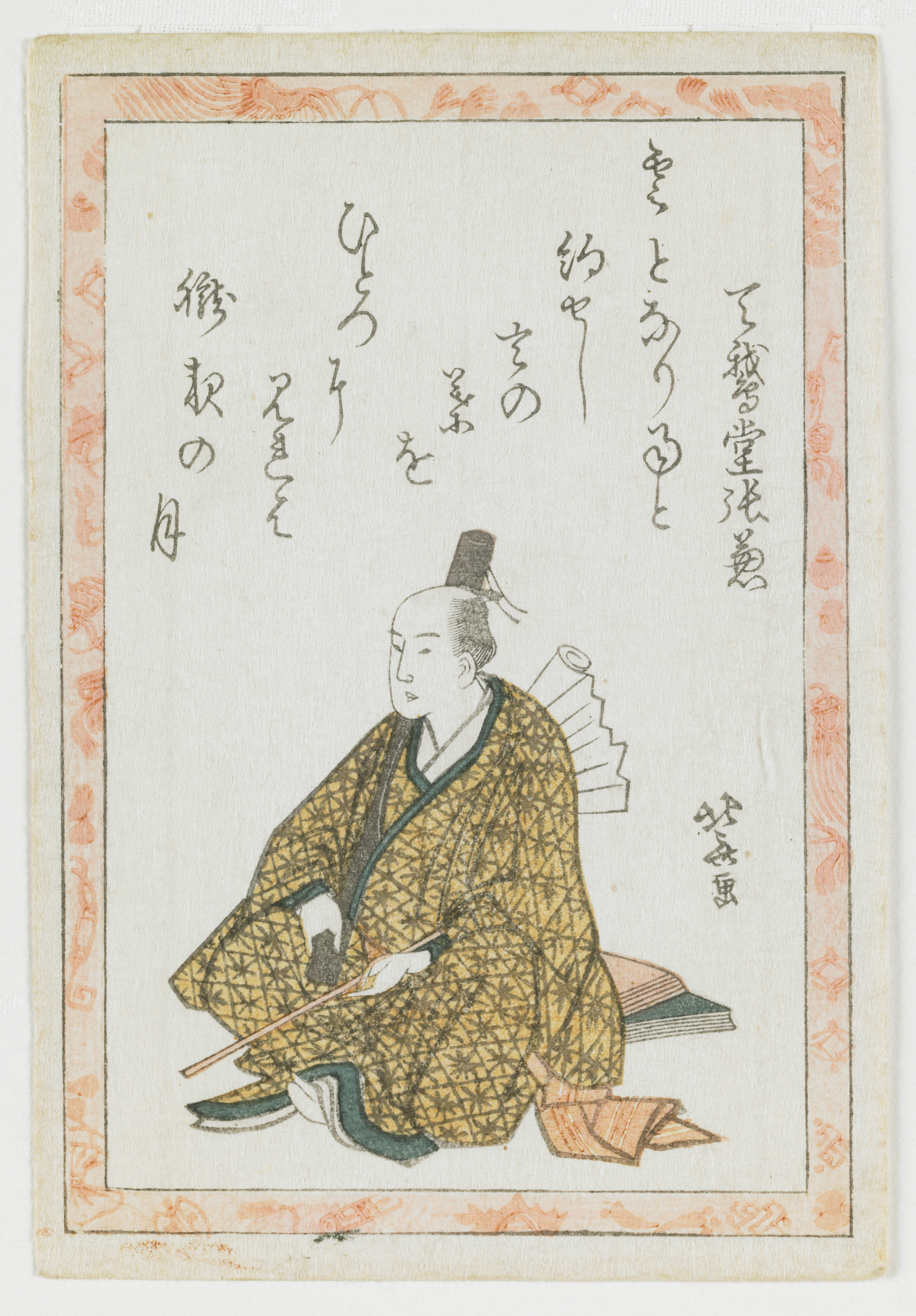 This print is from a large set (probably 100 in total) of privately printed deluxe woodblock prints (surimono). The small size of the prints in this set indicates that they were most likely used as playing cards during New Year celebrations. The prints in this series feature the literary form of kyoka ("crazy verse" or "mad verse"), which was revived in the city of Edo in the 1780s to parody courtly verse. The popularity of kyoka fostered a salon culture that included the most eminent writers, artists, and actors of the period. The kyoka poet depicted in this print is identified as Tengado Harigane. His name is given in one column of five characters at the far right, and his 31-syllable poem (in 24 characters) is printed in eight columns across the top of the sheet. The artist's signature, "Hokusai ga," is at the lower right.