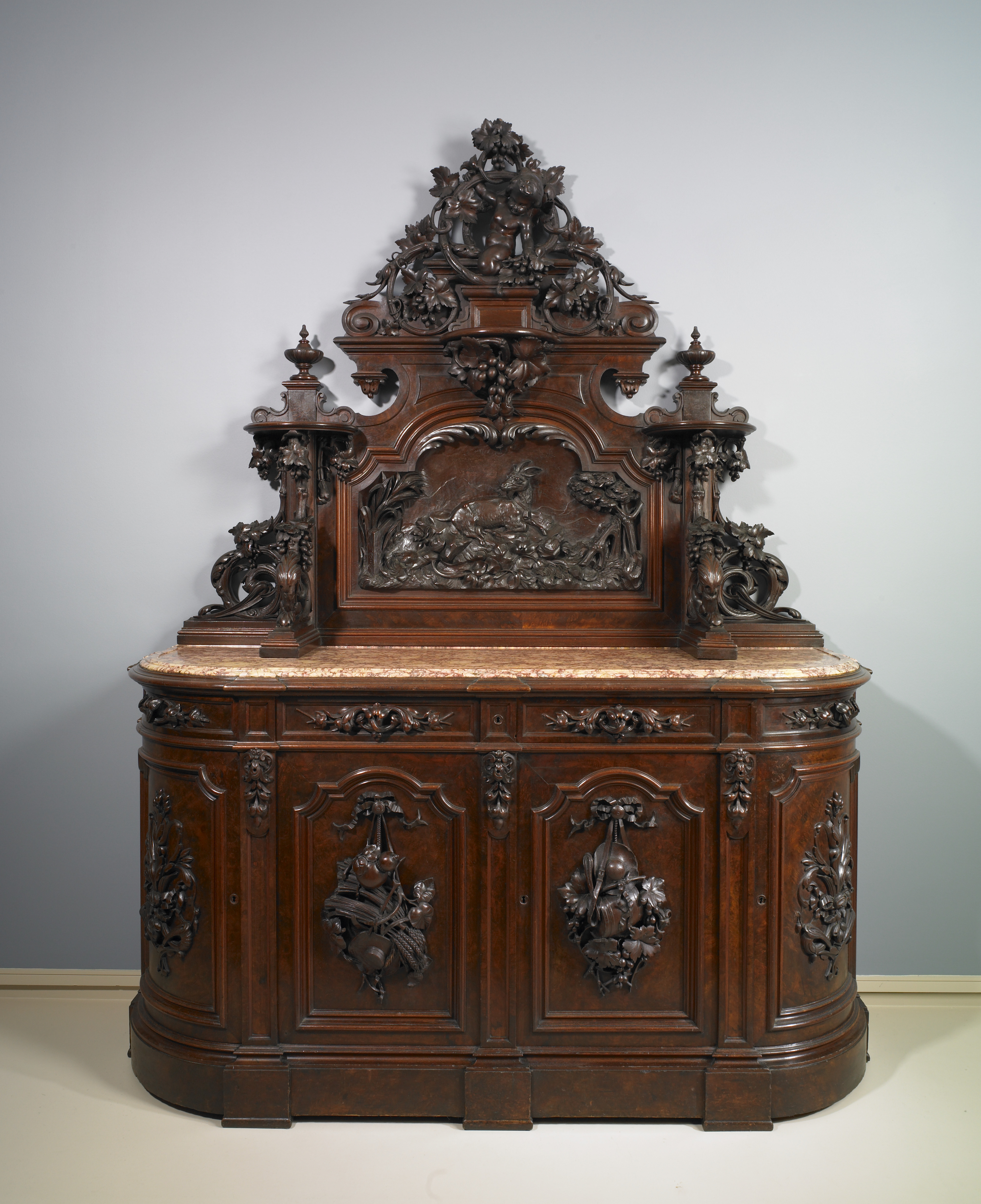 This extravagant sideboard features carved ornament that represents wine and agriculture, subjects appropriate to furniture intended for the dining room. Grape vines encircle a pudgy baby or putto at the top. Pendant grapes and the goat in the central panel may be emblems of Bacchus, the Roman god of wine. More grapes and a cask ornament one of the doors below. The inclusion of straw hats, sheaves of wheat, a hay fork, and a gourd bottle on the other door suggests agriculture, the harvest, or simply country life—all motifs for the enjoyment of the city dwellers who were Alexander Roux’s principal customers.