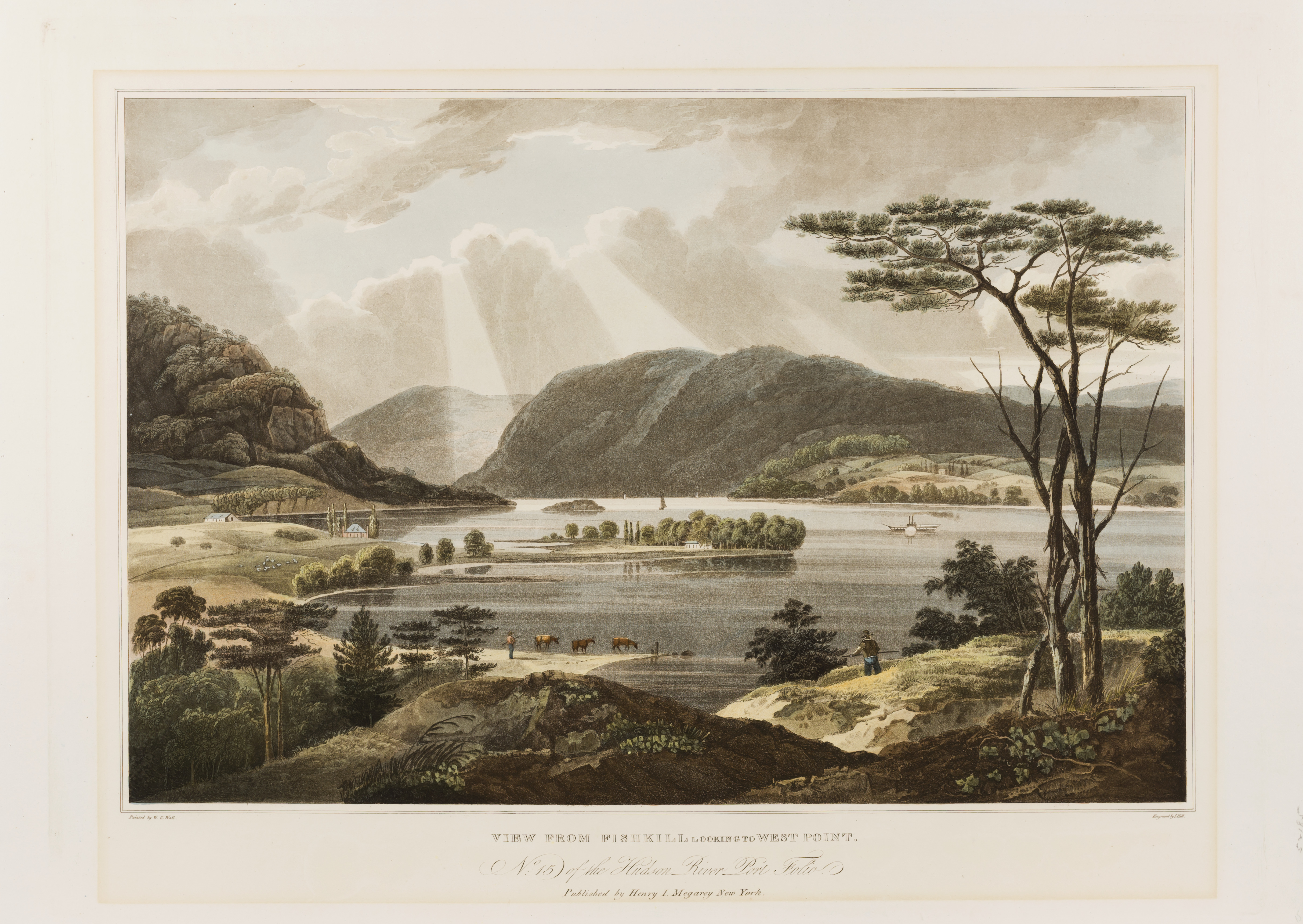 From a high vantage point, the viewer’s gaze is directed downriver past several sailing vessels toward West Point, a Revolutionary War site and America’s oldest military academy. The introduction of Robert Fulton’s steam-powered boat in 1807 provided a faster, more convenient mode of commercial river travel, and helped historical sites such as West Point become popular tourist destinations. The 1825 completion of the Erie Canal allowed further access to the interior of the country for curious travelers and the transportation of goods by connecting the Hudson River with the Great Lakes.