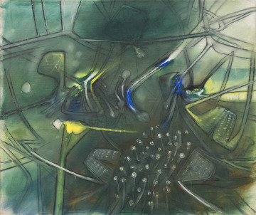 Roberto Matta presents a network of tubular forms within a swamp-like green expanse. Tiny silver eggs cluster at bottom right and, given the picture’s title, perhaps allude to a future rainstorm. The artist was much influenced by French Surrealism, particularly the practice of automatic drawing, where the hand is freed from rational control. Matta worked in New York during the 1940s and became a mentor for a generation of young American painters who shared his interest in abstraction and unconscious creative impulses.