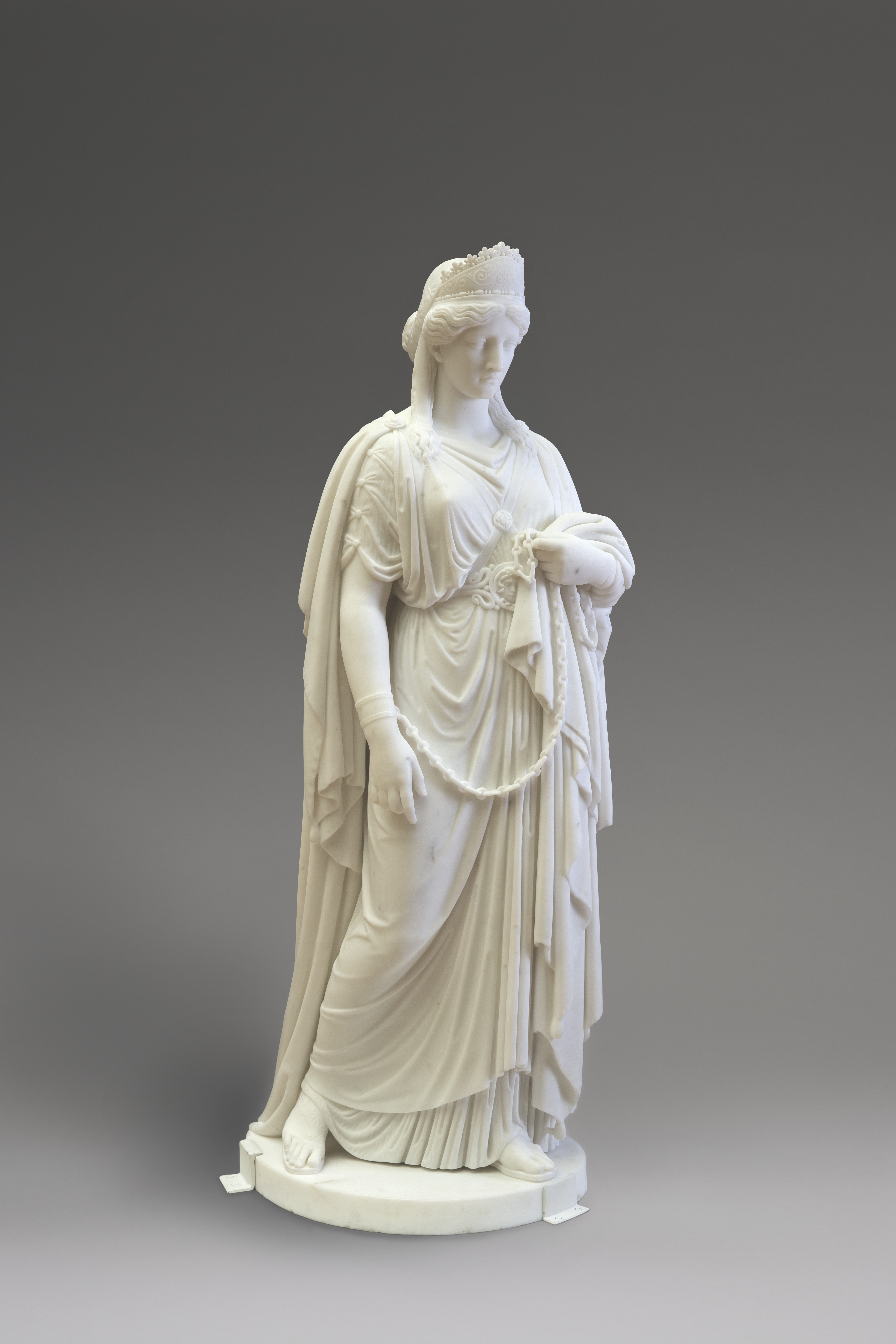The dignity of this figure’s profile—with her head held high—and the intricate details of her ancient dress testify to Harriet Hosmer’s carving abilities. Zenobia ruled Palmyra (in present-day Syria) for six years after her husband’s death in 267 CE. She conquered Egypt and reigned until defeated by Roman emperor Aurelian (reigned 270–75 CE), who triumphantly marched her in chains in a procession through Rome.