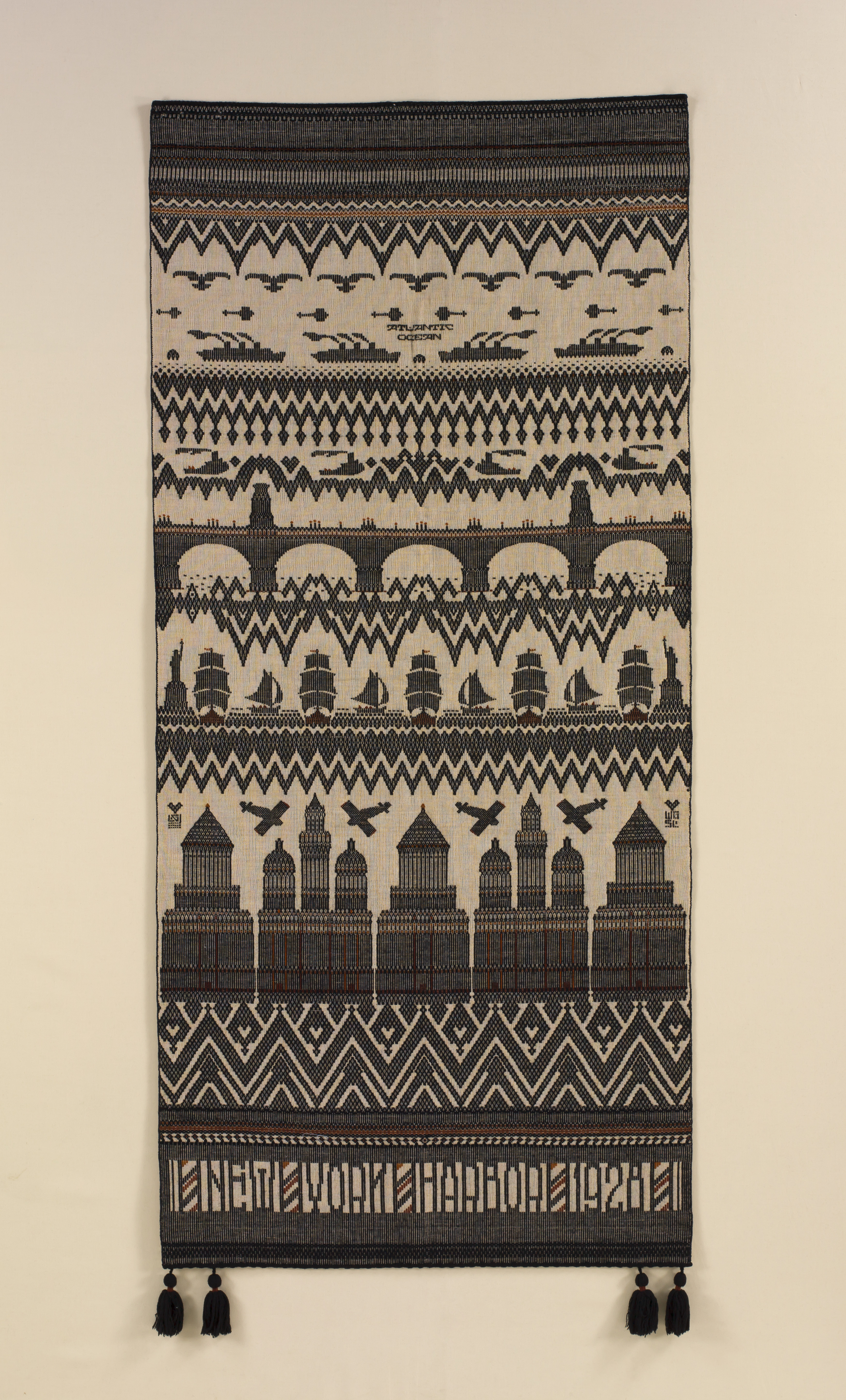 Symbols of modernity—ocean liners, airplanes, and skyscrapers—intermingle with old-fashioned sailboats and bridges in this stylized view of New York Harbor from 1928. Lillian Glaser, a native of Belleville, Illinois, wove this pictorial textile on a handloom, a slow and technically complex process. Glaser taught weaving at Washington University in St. Louis and was a founding member of the city’s Weavers’ Guild. She likely envisioned the design for this wall hanging on a 1925–26 leave of absence to pursue her artistic education in New York.