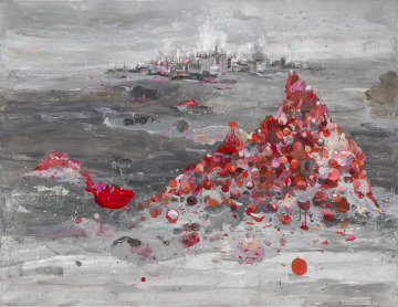 Lisa Sanditz's Christmas for Export depicts massive heaps of brightly-colored, discarded ornaments in a bleak landscape. It is one of the artist's "factory town" paintings, based on a year-long residency in China. The series explores the intersection of industry and nature, production and debris within the context of the global marketplace. In this work, Sanditz's painterly approach and palette enable her to tread the line between abstraction and representation. She embraces this compromised landscape, reimagining and transforming it to achieve a kind of post-modern sublime.