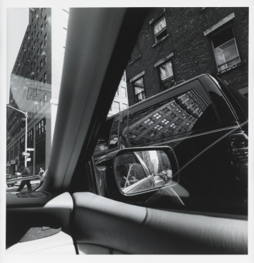 From Lee Friedlander’s series America by Car, this image incorporates the interior structure of a rental car to frame the architecture of downtown New York City. Buildings at various angles are visible through the windows, in the side mirror, and even in the reflection on the adjacent SUV. It is a timely comment on how Americans increasingly experience the outside world through the confines of the automobile, as well as a dynamic composition where lines simultaneously point forward, sideways, and backward.