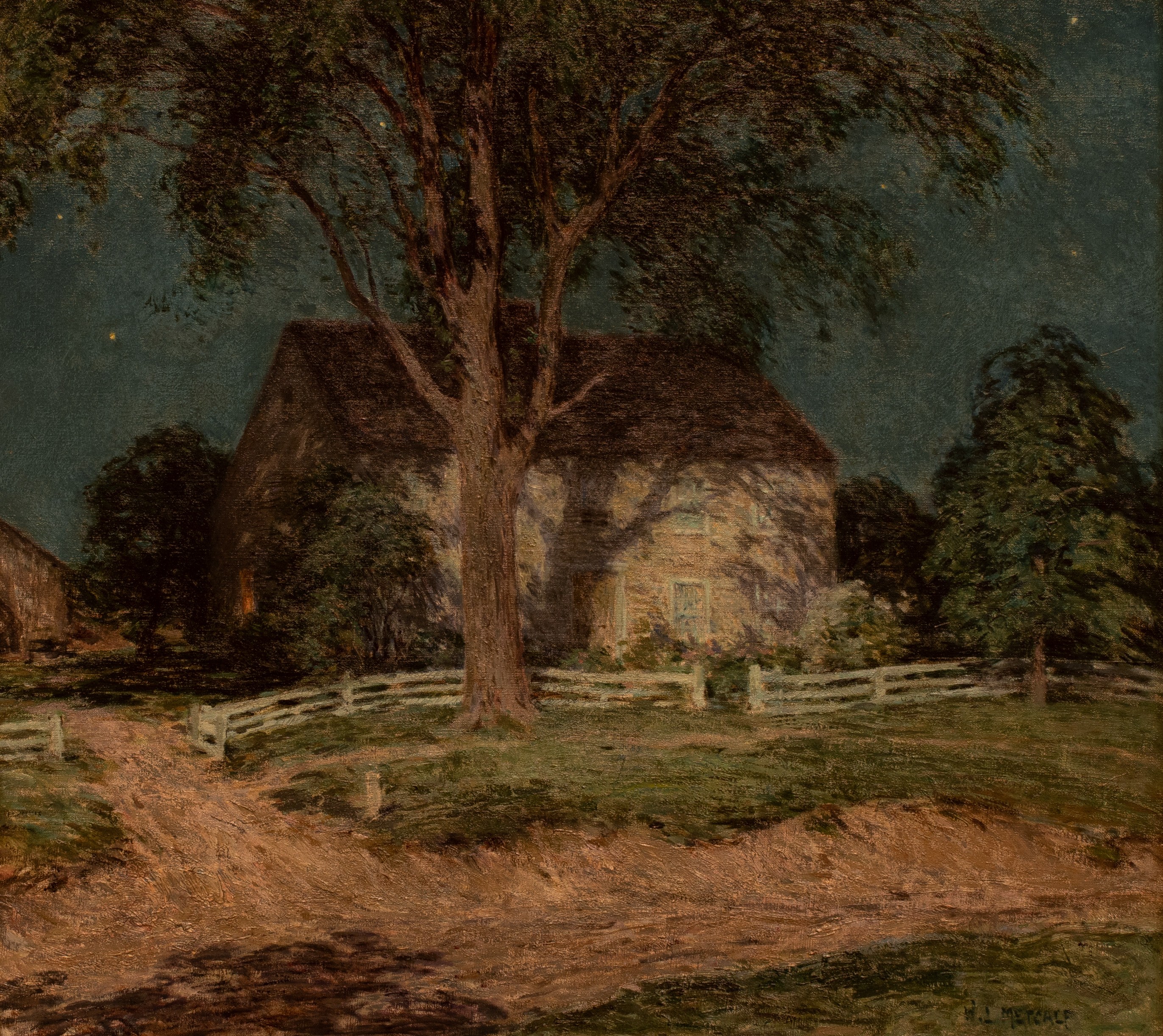 Cool, bright moonlight bathes the Selden homestead, built before the Revolutionary War (1775–1783). The large tree—as old as the house—casts its long shadow over the buildings, as the stars in the clear sky twinkle through its wide, protective branches. The homestead is located in Hadlyme, Connecticut, only 10 miles from where Willard Metcalf spent his summers painting as a member of the well known art colony in Old Lyme.