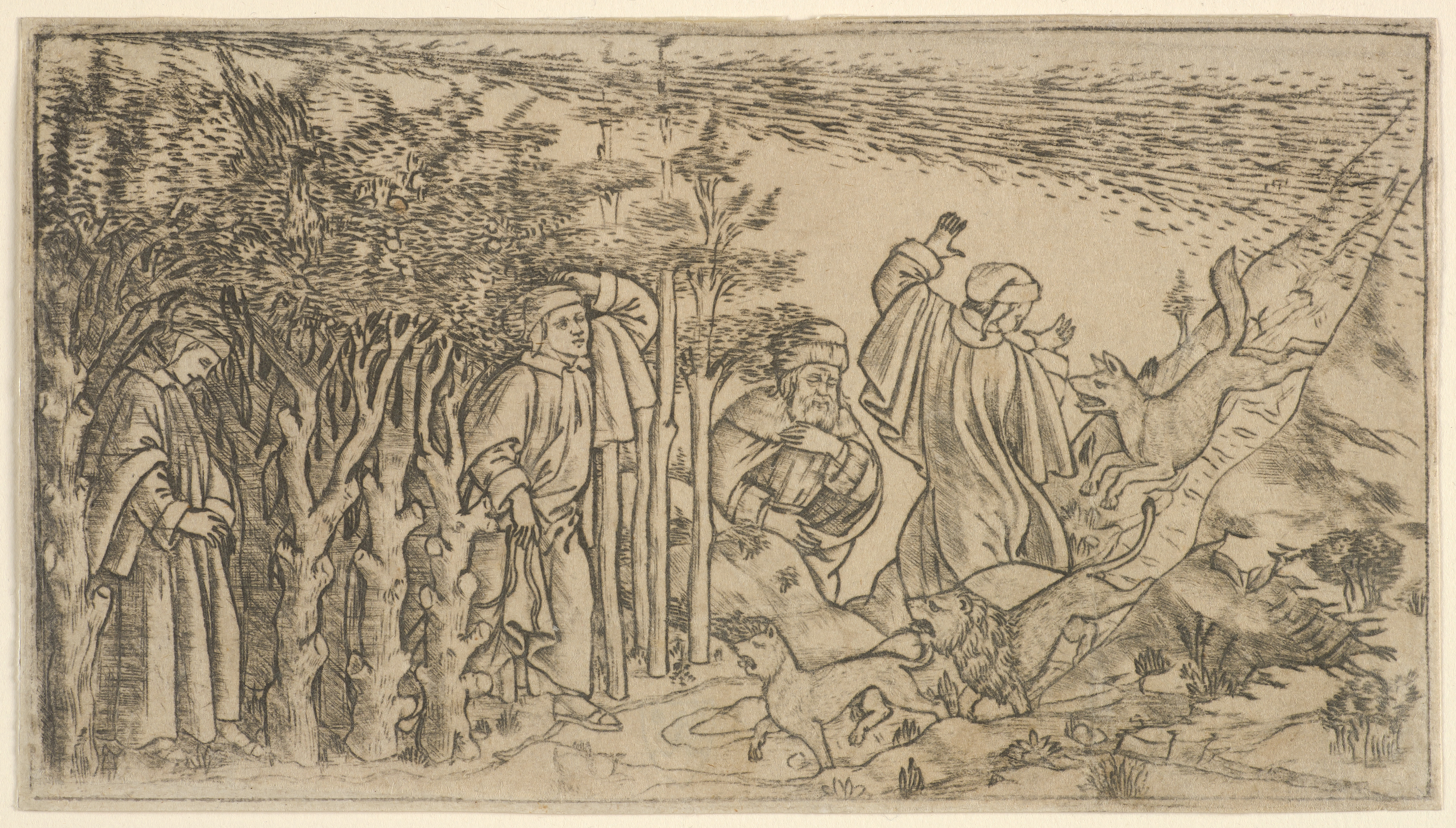 This small engraving illustrates the first part of The Divine Comedy by the 14th-century Italian poet Dante Alighieri. The print combines several episodes from Dante’s poem. The poet is the story’s main character, and moving from left to right, he wanders through the woods, and is then attacked by a lion, a panther, and finally a wolf. In the center, he meets the ancient Roman poet, Virgil, who will guide him on his journey through purgatory and hell.
