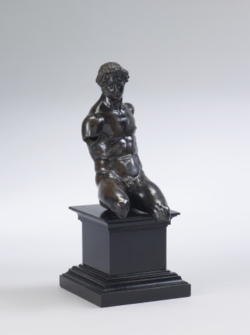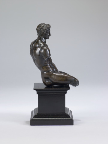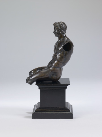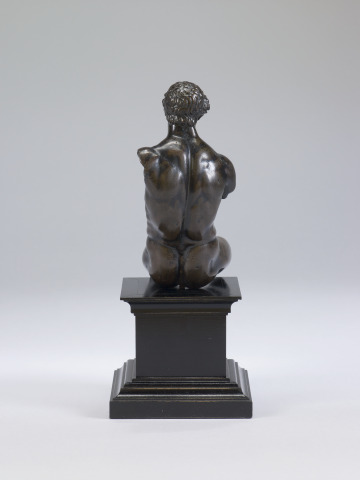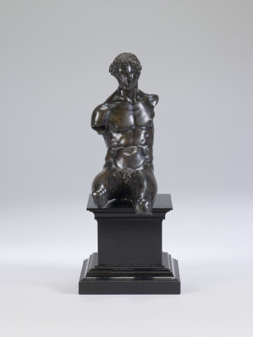 This bronze depicts the ancient Roman god Apollo, the god of music and the sun. The sculpture was based on a well-known fragment of an ancient sculpture known as the Torso Belvedere, named for its location in a Vatican courtyard. The antique marble displays exaggerated muscles and a slightly twisted body. The artist who created this smaller 16th-century sculpture used a more upright pose and less pronounced musculature, reflecting a more measured approach to representing the human form. The artist based the head on ancient images of Apollo with its aquiline nose and idealized features.