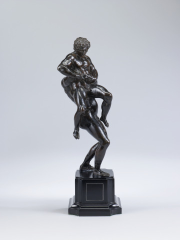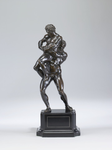 The ancient Roman hero Hercules, known for his legendary strength, wrestles the giant Antæus, son of the earth goddess Gaia. Hercules struggles to lift his adversary off the ground, since that is the source of his opponent’s strength.