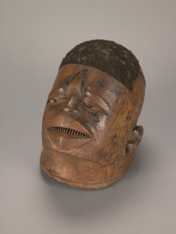 The "lipiko" is a carved wooden mask representing a human face. Made of soft, lightweight wood, it is most frequently helmet-like in form and fits over the upper half of the wearer’s head, covering his ears, eyes, and nose, so that he looks out through the mask’s mouth. The term "lipiko (pl. mapiko)" refers to both the mask and the masked dancer among the Makonde, who perform in complex masquerades representing a range of characters. "Mapiko" may depict any human or animal subject, but historically the most common are Makonde men and women, recognizable by their ethnically distinct facial ornamentation such as tattoos, lip plugs, and chipped teeth. The tattoos are rendered in appliquéd strips of blackened wax on the mask, and hairstyles are created with actual human hair.