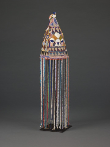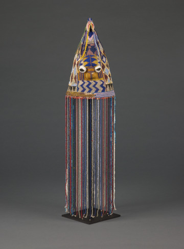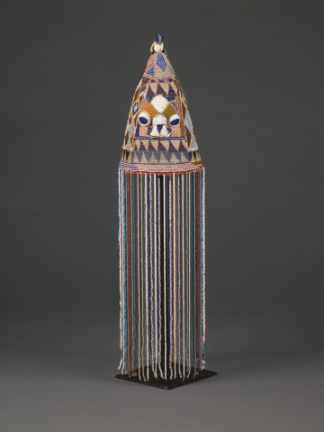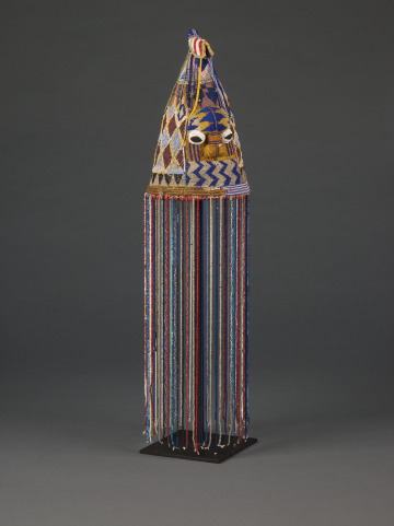 Lavish glass beading on this crown emphasizes the wealth and power of a Yoruba "oba" (king). Glass beads, imported from eastern Europe and northern Italy via transatlantic trade, became an important signifier of wealth. This crown’s veil concealed the face of the oba; the luxury of bountifully beaded ornamentation further underscored the separation between a semidivine king and his constituency. The crown’s principal conical shape highlights the significance of an oba’s "ori inu," the "inner head," which in Yoruba belief holds one’s character, intellect, destiny, and spiritual essence. The ori inu takes precedent over the "ori ode," one’s physical "outer head."