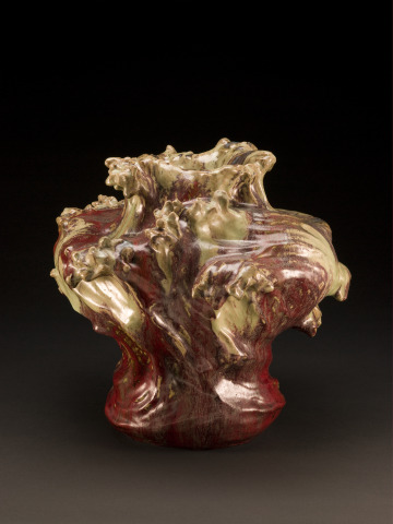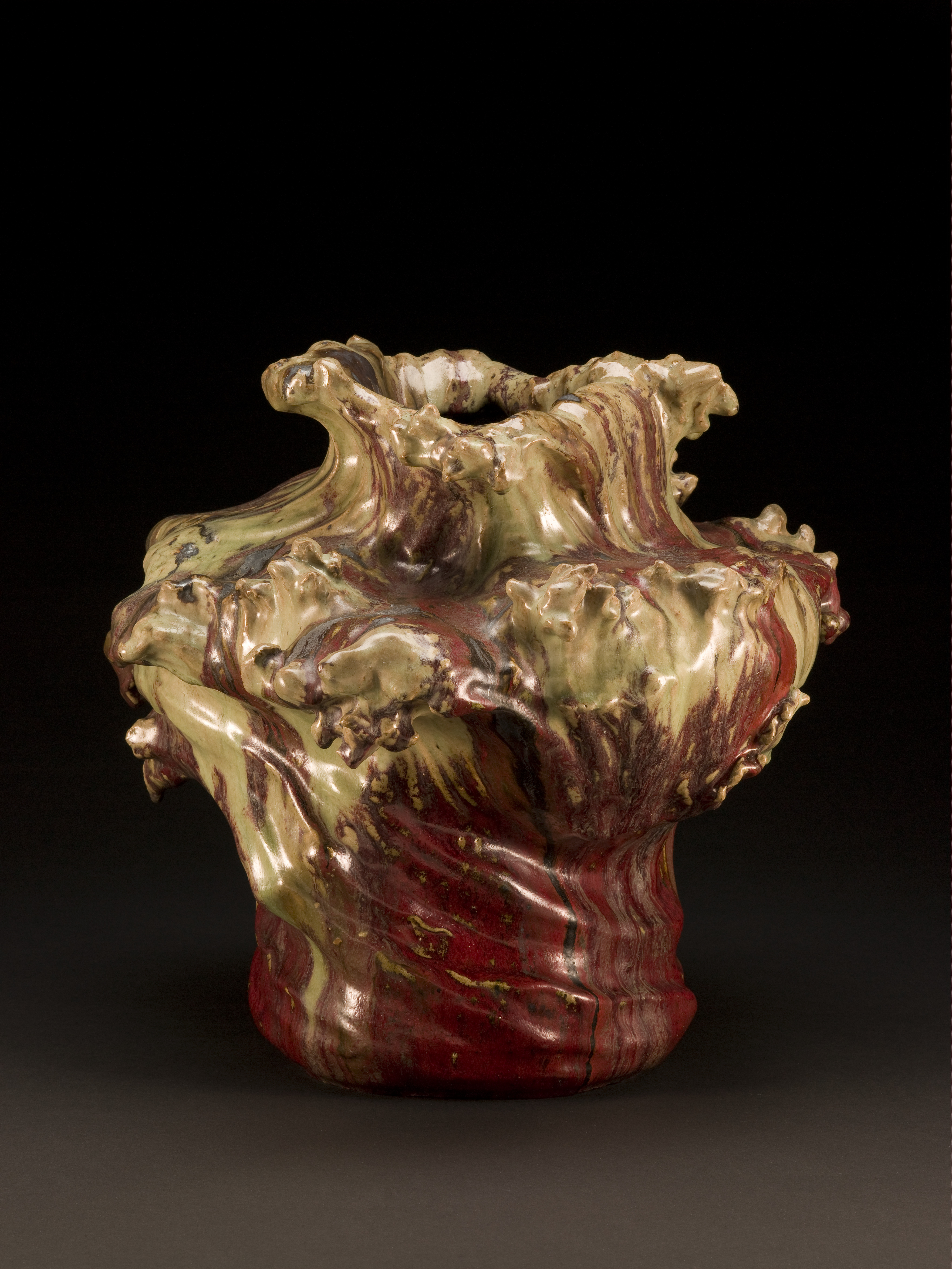 This extraordinary vase entitled The Sea, or La Mer, evokes the form and action of water. Projections around the mouth and shoulder are the momentary froth of cresting waves while the color of the ocean is suggested by glazes of crystalline green streaked with red. Pierre-Adrien Dalpayrat was one of the most prominent ceramists in late 19th-century France; his gift for capturing the movement of water can be compared to that of the Impressionist painters.