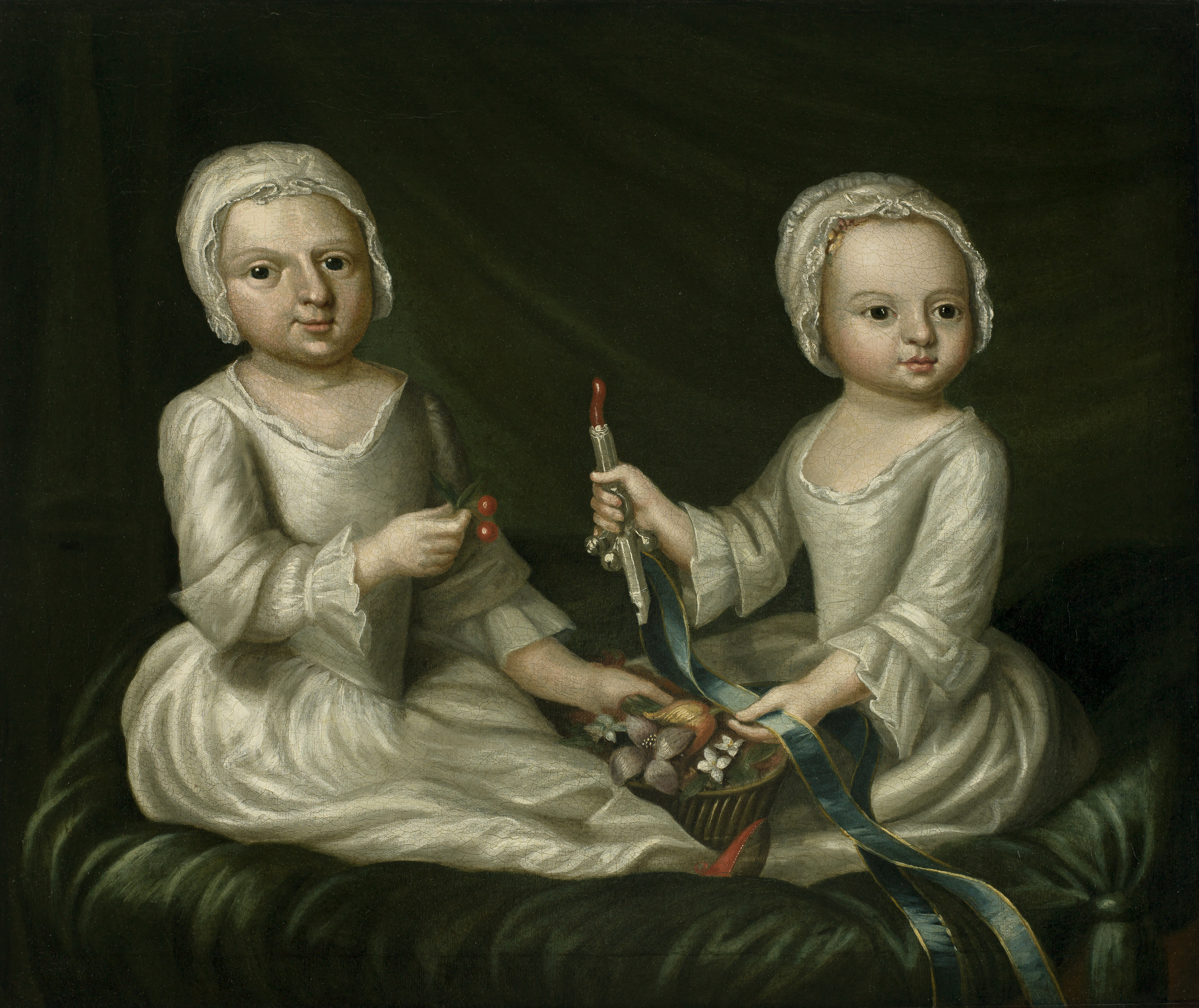 The sweet character of Joanna is symbolized by the cherries she holds. Her basket of flowers suggests childhood innocence. Elizabeth holds a silver toy with a whistle on the bottom, bells at the middle, and a red coral teether on top. Teething was considered potentially life threatening, and coral was thought to protect children from sickness and danger.