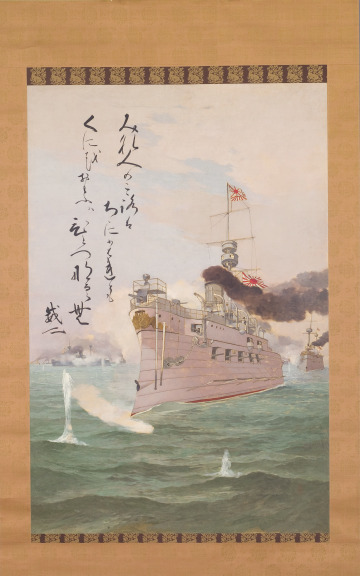 This portrait of the Matsushima, a former flagship of the Imperial Japanese Navy, is a rare oil painting on silk. Kobayashi Kiyochika’s skillful handling of oils is evident in the hazy sky and the choppy water with explosions rupturing its surface. Prince Arisugawa-no-miya Takehito (1862–1913) commanded the Matsushima from December 5, 1894, through May 18, 1895, during which period the cruiser was badly damaged in the Battle of the Yellow Sea off the coast of China.