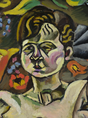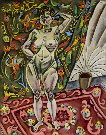 In this early work, painted in Barcelona, Spain, Joan Miró depicted an imposing nude. The figure inhabits an interior with an ornate rug, a spindly plant, and a densely patterned tapestry. The artist’s faceted treatment of the nude’s form indicates the influence of Cubism; the birds and flowers on the tapestry behind anticipate organic themes of Miró’s mature Surrealist work. Miró moved to Paris in 1920 and soon proceeded to produce more abstract and dreamlike paintings. He became an important figure within the Parisian Surrealist group.