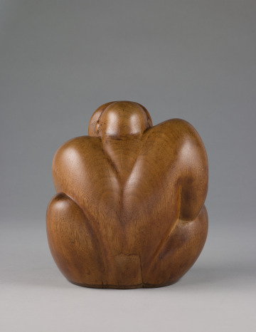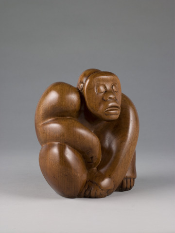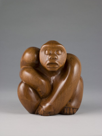 “Gorilla” features smooth surfaces, abstracted forms, and a masklike face. These elements are evidence of Houston Chandler’s search for “the simplicity that brings out the greatest line of expression.” Though the gorilla rests in a hunched pose, its muscular limbs, arranged in diagonals across its body, allude to its physical power.