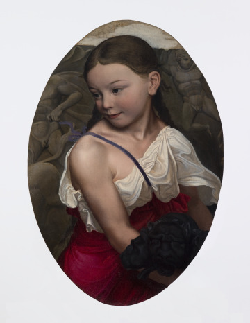 [1] Schinkel began these three paintings of his children as one life-size group portrait. The painting was unfinished at the time of Schinkel's death in 1841, and his descendants later cut out these portraits from the larger canvas. Alfred von Wolzogen, Schinkel's son-in-law, includes the painting in his multi-volume catalogue raisonné of Schinkel's work. The entry in the 1862 publication states (translated): "Schinkel's children, Marie, Susanne and Karl, seven, six and four years old. Begun in 1817 or 1818, but not finished. 7 feet high, 4 foot 11 inches wide. (In the possession of Miss Susanne Schinkel in Berlin)" [Wolzogen, Alfred von. "Aus Schinkel's Nachlaß: Reisetagebücher, Briefe und Aphorismen. Mitgetheilt und mit einem Verzeichniß sämmtlicher Werke Schinkel's versehen." Berlin: Verlag der Königlichen Geheimen Ober-Hofbuchdruckerei (R. Decker), vol. II, 1862, p. 340, no. 26].