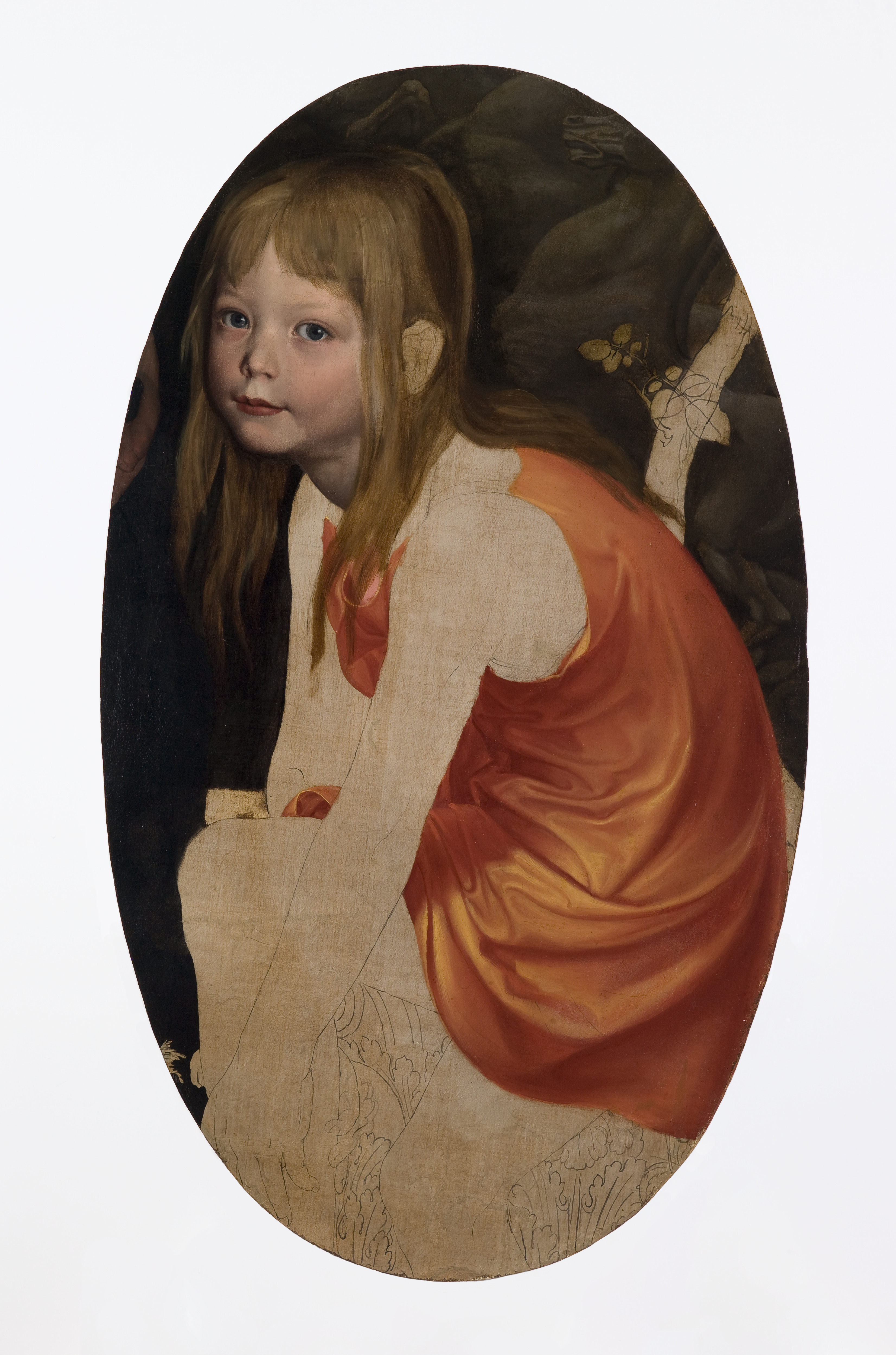 [1] Schinkel began these three paintings of his children as one life-size group portrait. The painting was unfinished at the time of Schinkel's death in 1841, and his descendants later cut out these portraits from the larger canvas. Alfred von Wolzogen, Schinkel's son-in-law, includes the painting in his multi-volume catalogue raisonné of Schinkel's work. The entry in the 1862 publication states (translated): "Schinkel's children, Marie, Susanne and Karl, seven, six and four years old. Begun in 1817 or 1818, but not finished. 7 feet high, 4 foot 11 inches wide. (In the possession of Miss Susanne Schinkel in Berlin)" [Wolzogen, Alfred von. "Aus Schinkel's Nachlaß: Reisetagebücher, Briefe und Aphorismen. Mitgetheilt und mit einem Verzeichniß sämmtlicher Werke Schinkel's versehen." Berlin: Verlag der Königlichen Geheimen Ober-Hofbuchdruckerei (R. Decker), vol. II, 1862, p. 340, no. 26].