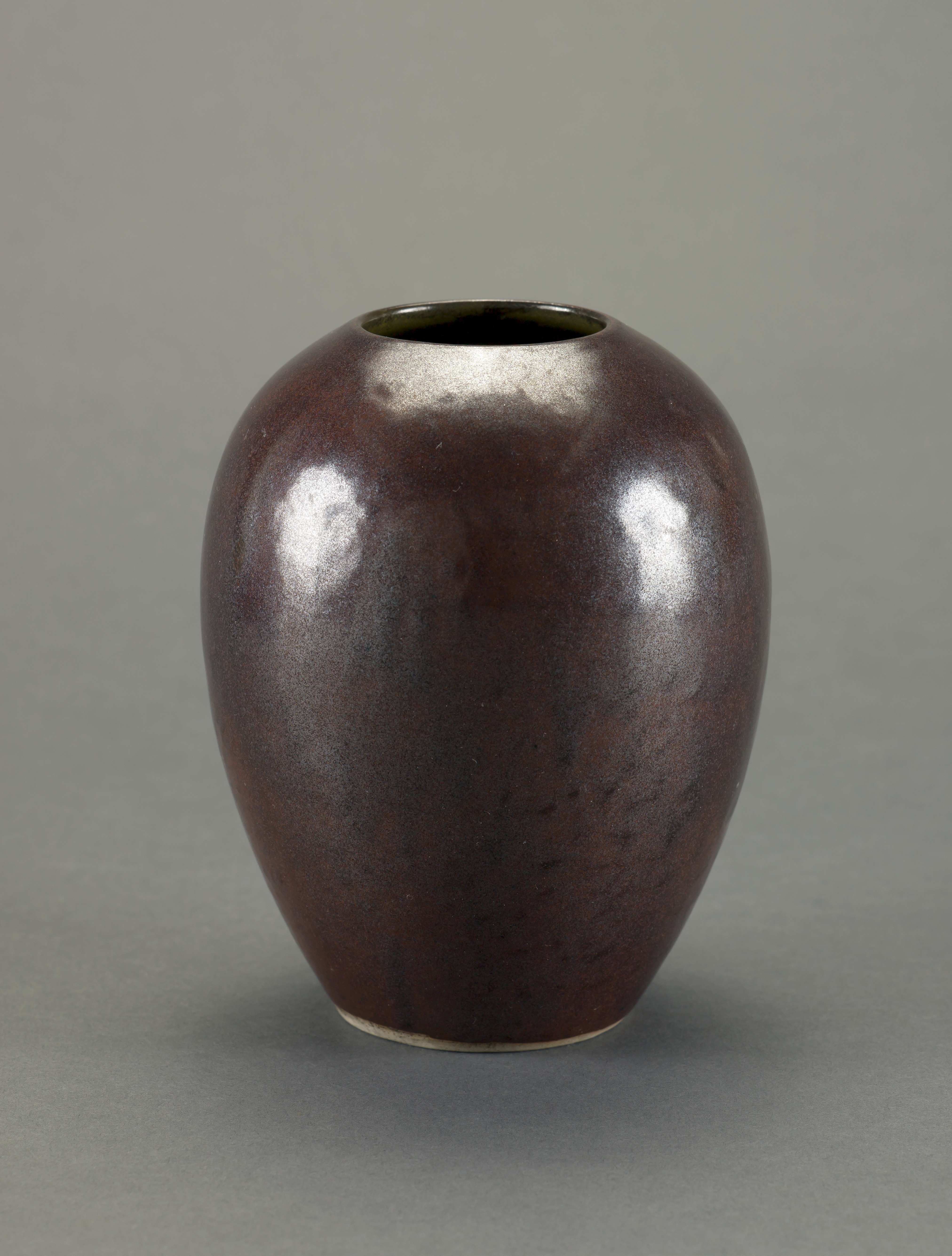 This oval jar with broad shoulders and wide mouth presents an elegant, minimal form and a subtle, metallic, brownish-black glaze. The glaze is of the “saturated-iron” type, in which the iron separates from the glaze base during firing. The rust color then developed as the iron re-oxidized and crystallized on the cooling surface of the jar.