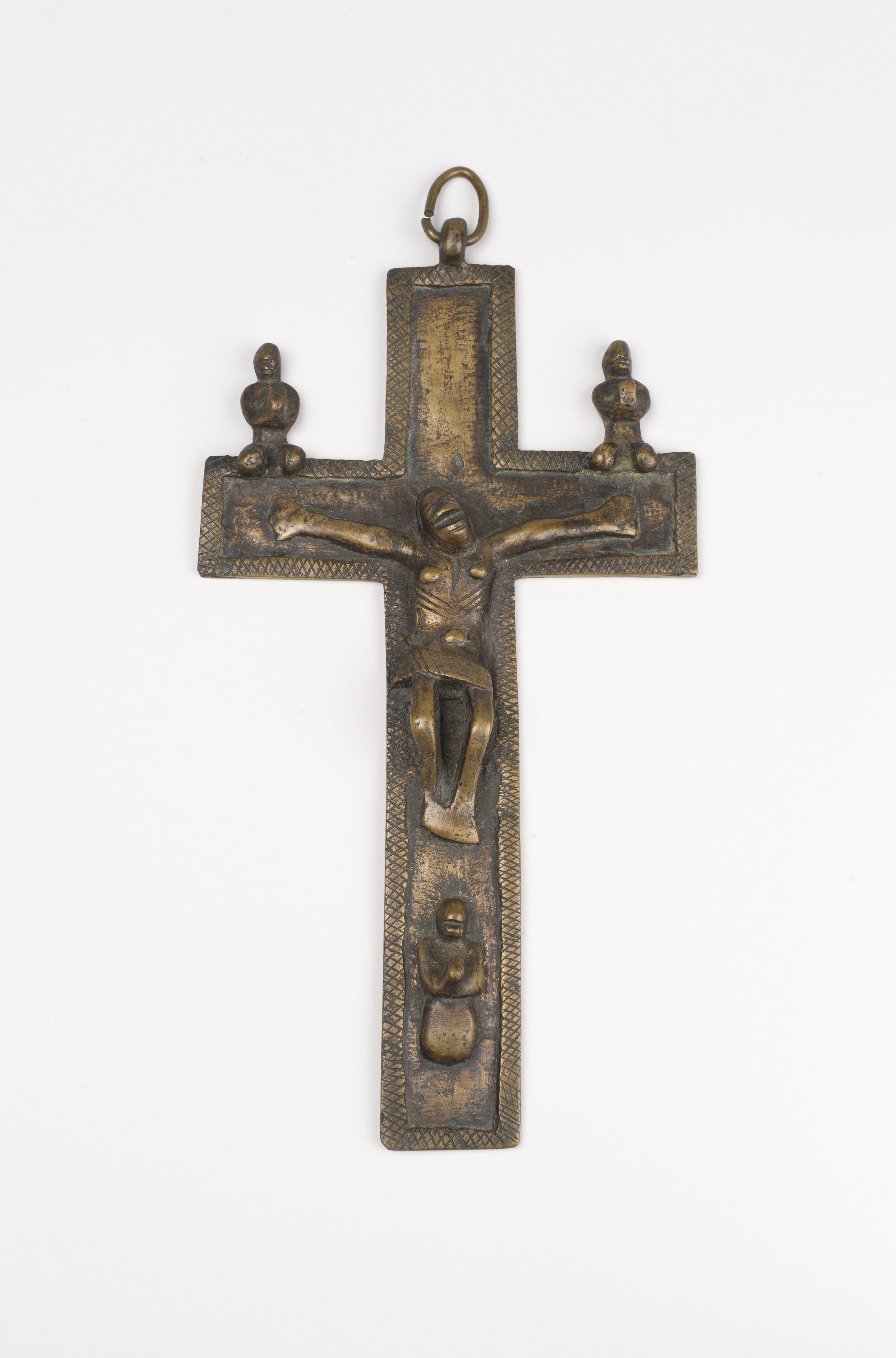 At the end of the 15th century, the Portuguese arrived along the west coast of Africa and introduced Christianity to the Kingdom of Kongo. The king of Kongo, Nzinga a Nkuwu (reigned 1470–1509), and other Kongo rulers willingly converted to Christianity and instituted Catholicism as the state religion. Converts to the religion commissioned crucifixes that blended Christian imagery with local artistic expressions. Flanked by praying attendants, the central figure of Jesus in this example has stylized facial features and extremities.