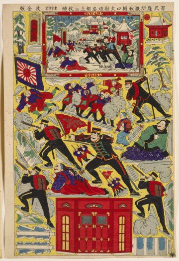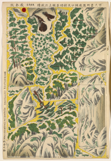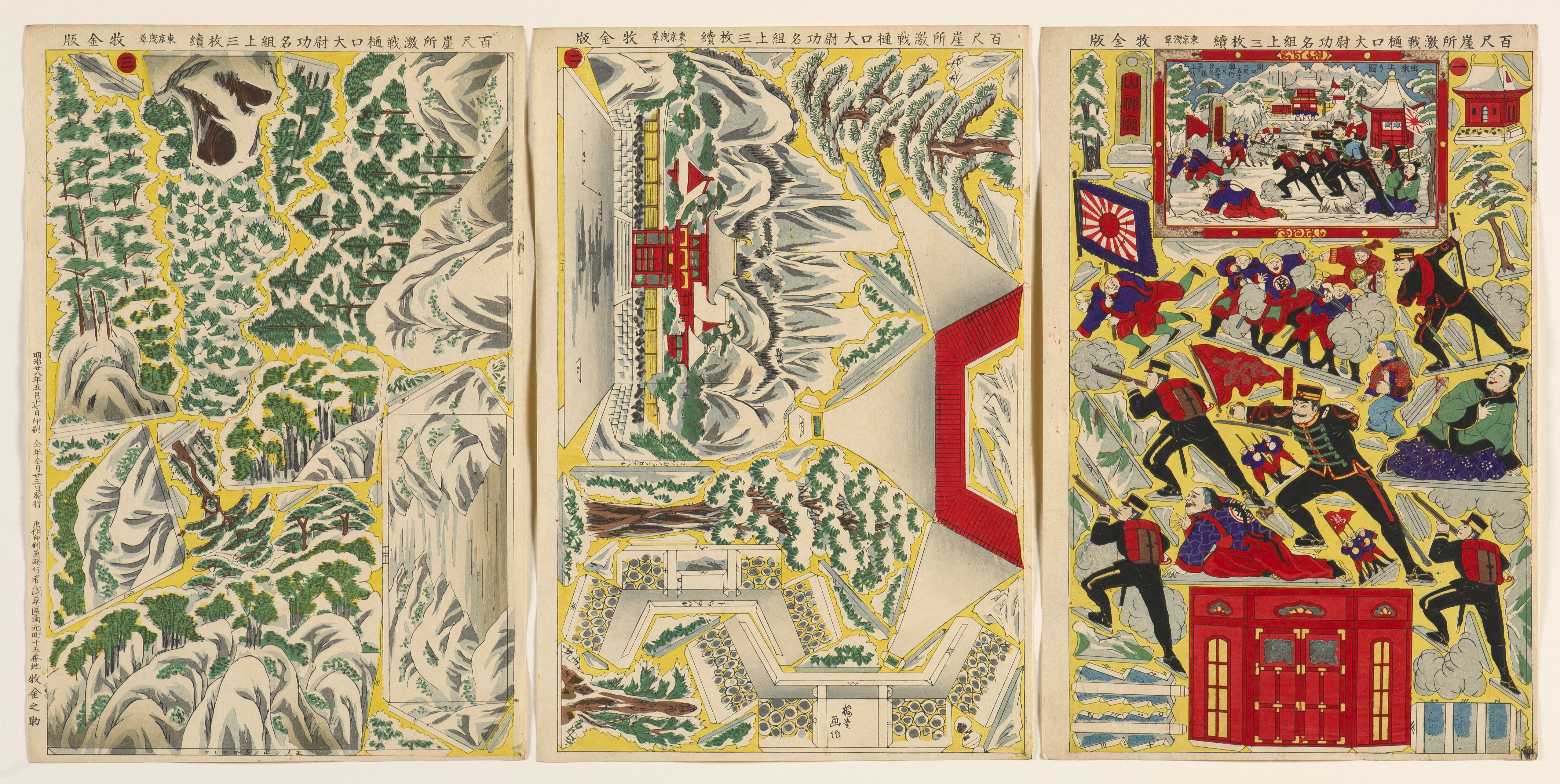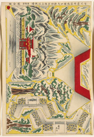 Miniature Three-Sheet Cut-Out Diorama (kumiage) of the Great Achievement of Captain Higuchi during the Violent Battle at the Site of the Hundred-Foot Cliff