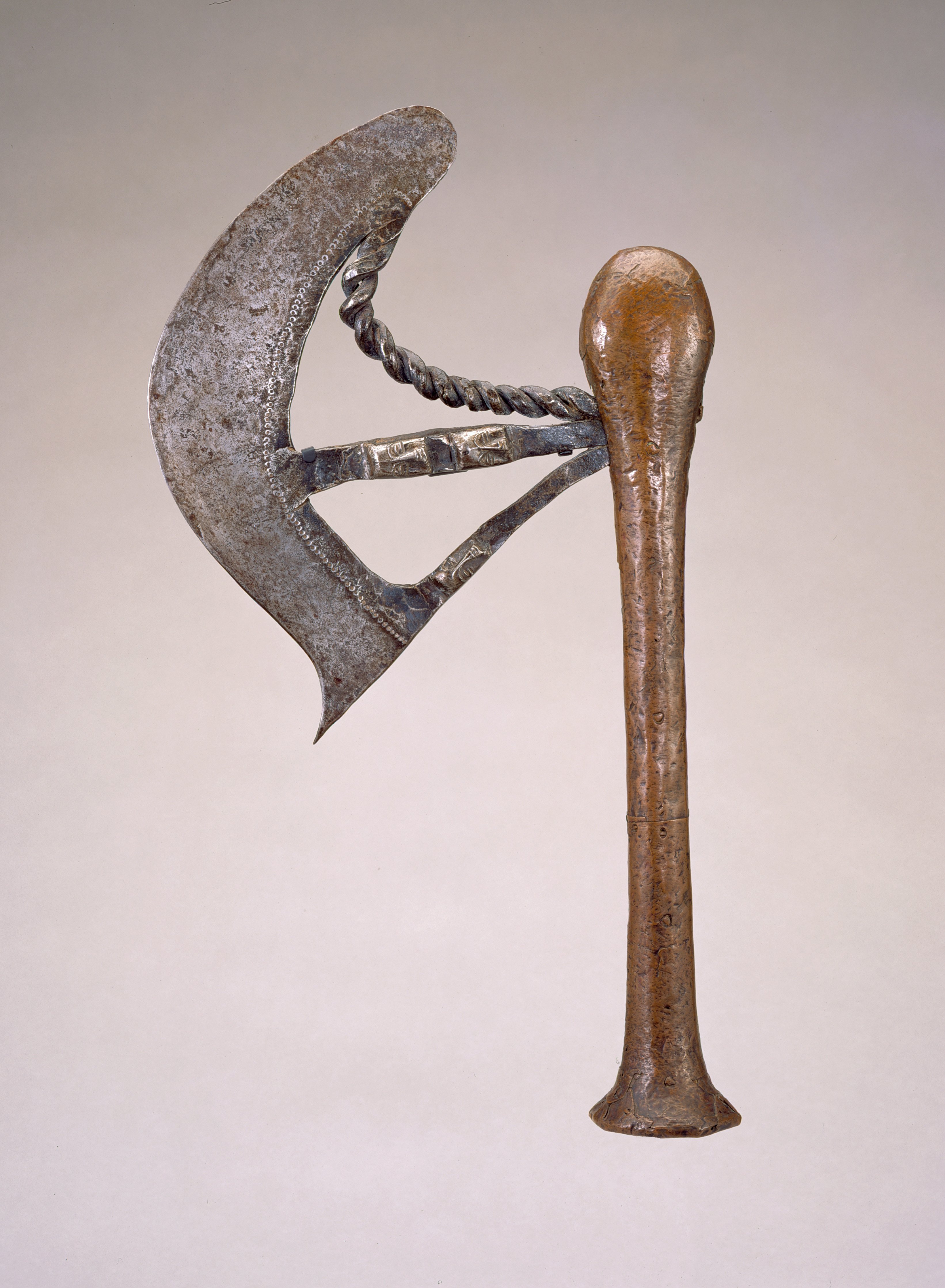 This axe consists of a copper-covered wood handle and three iron struts attached to a blade. Three embossed heads appear on the viewer's side of the axe with two more on the opposite side. The heads may represent masks used in Songye festivals, or they may symbolize peoples who were conquered by the Songye. Ceremonial weapons such as this one symbolized high office and were solely the property of chiefs.