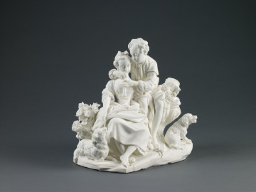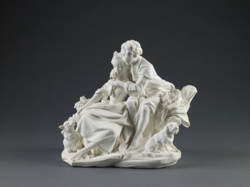 This pair of porcelains, based on a 1752 comic operetta, represents the romance between a shepherd (unnamed) and a shepherdess (Lisette). In one, the shepherd teaches Lisette to play his flute—he fingers the notes while she blows into the instrument. Given its phallic shape, the flute sometimes carried a sexual connotation. In the related piece, the shepherd feeds grapes to his beloved. Shepherds and shepherdesses in amorous couplings appear frequently in the painting, sculpture, and decorative arts of the 18th century. Mme Du Pompadour, the favorite mistress of Louis XV, owned examples of this pair.