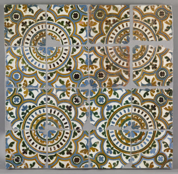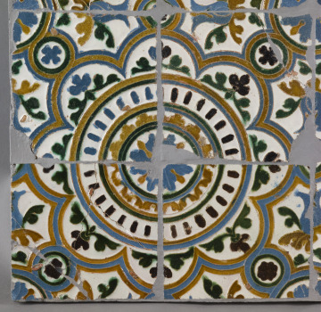 These tiles would have formed part of a much larger panel decorating the lower portion of an indoor wall. They were made using the cuenca technique, also known as arista, designed to prevent the bright colors of the glaze from running together during firing. Before firing, the still-moist tile would be pressed into a mold, which would create ridges outlining the design and separating the areas where different colored glazes would be applied. Each tile forms one quarter of a design which can be endlessly repeated, just as the patterns on the doors to the left and the stucco panels to the right also lend themselves to endless repetition. The cuenca technique was invented in either Seville or Toledo as a cheaper, yet still aesthetically effective, substitute for cuerda seca (which can be seen in the border tiles on the panel to the left of the monumental doors). Large quantities of such cuenca tiles were mass-produced, and identical tiles can still be seen in situ at the Convent of Santa Isabel in Toledo.