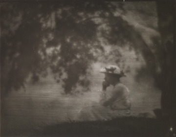 George H. Seeley’s sister sits in a romantic, dream-like setting on the bank of a river or pond. In spite of the title, this photograph does not resemble a typical portrait. The soft focus, delicate tone, and arched framing of the leaves above the figure’s head give the photograph a painterly feeling. Horizontal lines drawn across the negative add texture to the water. As a Pictorialist, George Seeley created photographs as an expressive art form rather than factual documentation.