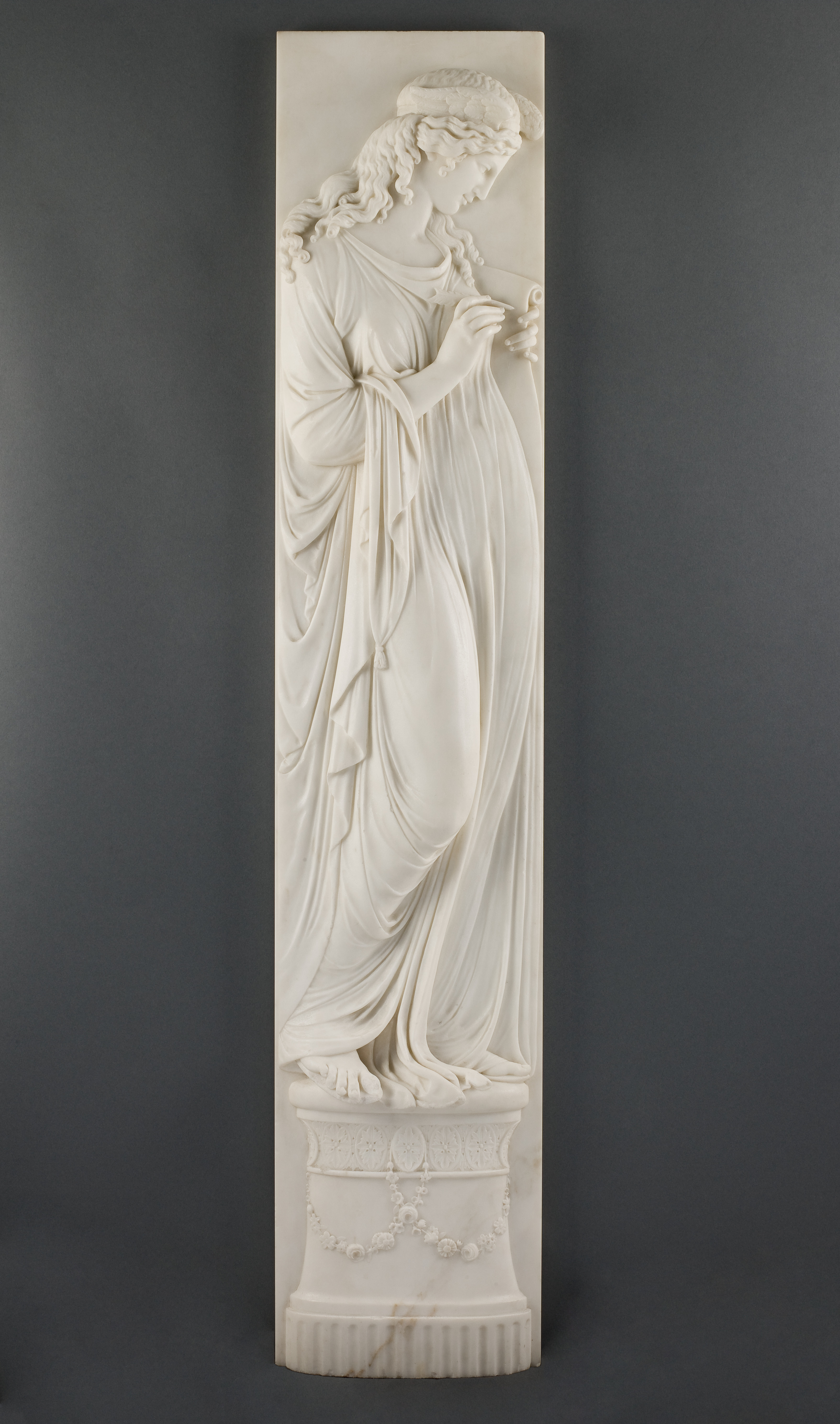 The panel shows Calliope, the daughter of the ancient Greek god Zeus and Mnemosyne, who was the chief of the Muses. Known as the inspiration for Homer’s poems the Iliad and the Odyssey, Calliope holds a scroll indicating her role as the muse of epic poetry.