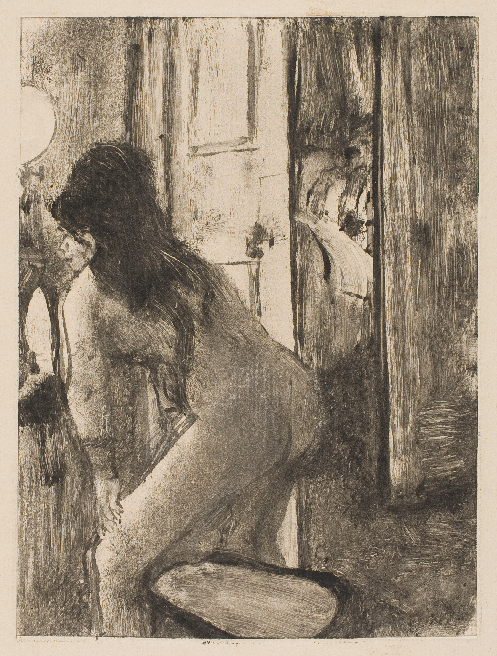 [2] Monotypes figured in at least two posthumous sales from Degas's studio on November 22-28, 1918 ("Scenes de maisons closes, 16 pieces, 8500 fr.-"); and June 12, 1934 ("9+2 d'estampes et monotypes"). It is not clear when Vollard acquired this impression, but he reproduced it in 1935 [Samosatenus, Lucianus; trans. by Pierre Louÿs. "Mimes des courtisanes de Lucien." Paris: Ambroise Vollard, 1935, plate III (facing p. 56)].