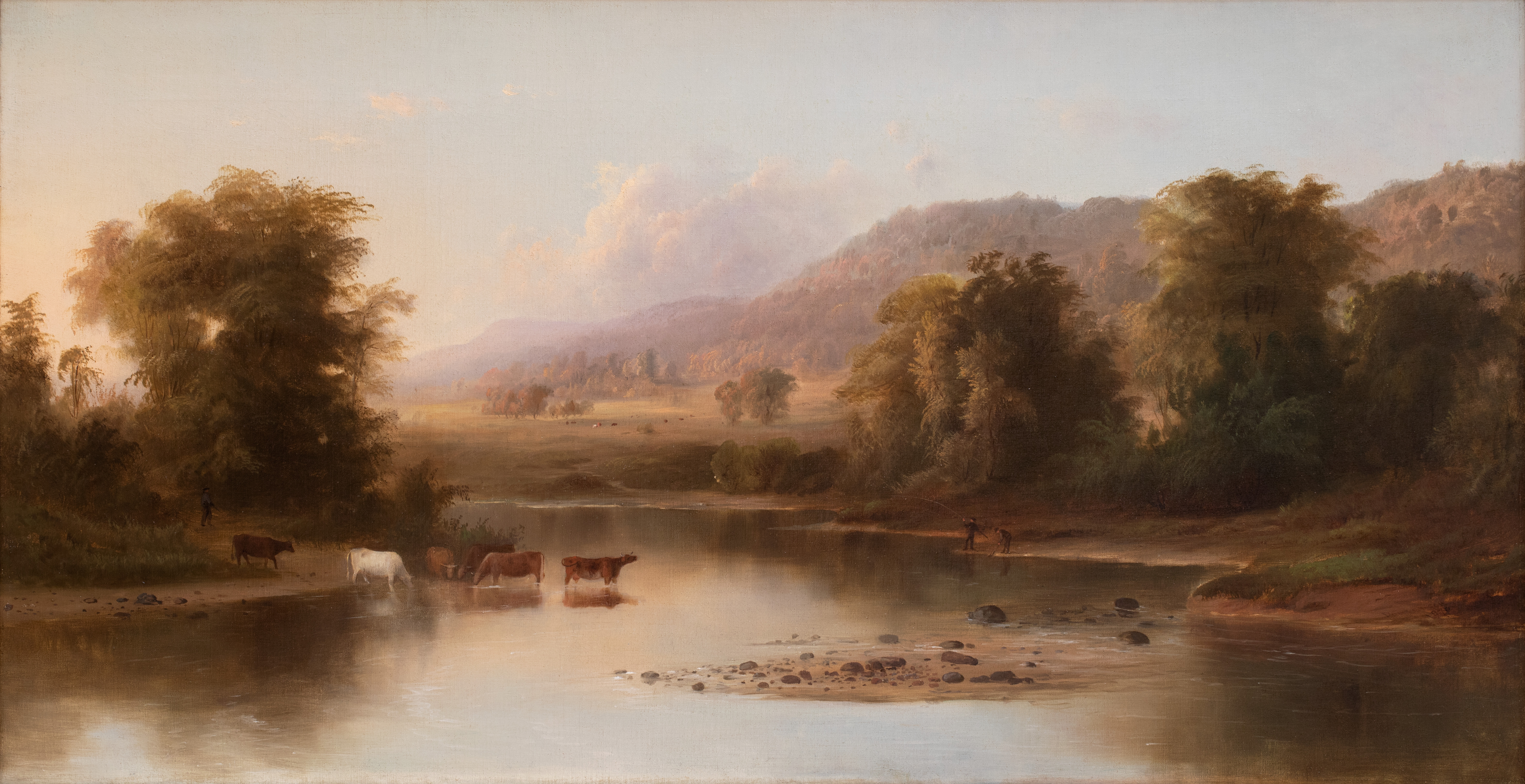 Pervasive golden light, reflected in the smooth surface of the river, establishes the tranquil mood of this landscape. A small herd of cattle wades in the shallow water, undisturbed by the fishermen in the distance. Robert Duncanson created this painting from sketches he had made on a trip to Canada in 1869. Duncanson was one of the first African American painters to experience success in the United States. He felt his paintings measured up to the work of European artists, commenting that “of all the landscapes I saw in Europe (and I saw thousands) I do not feel discouraged."