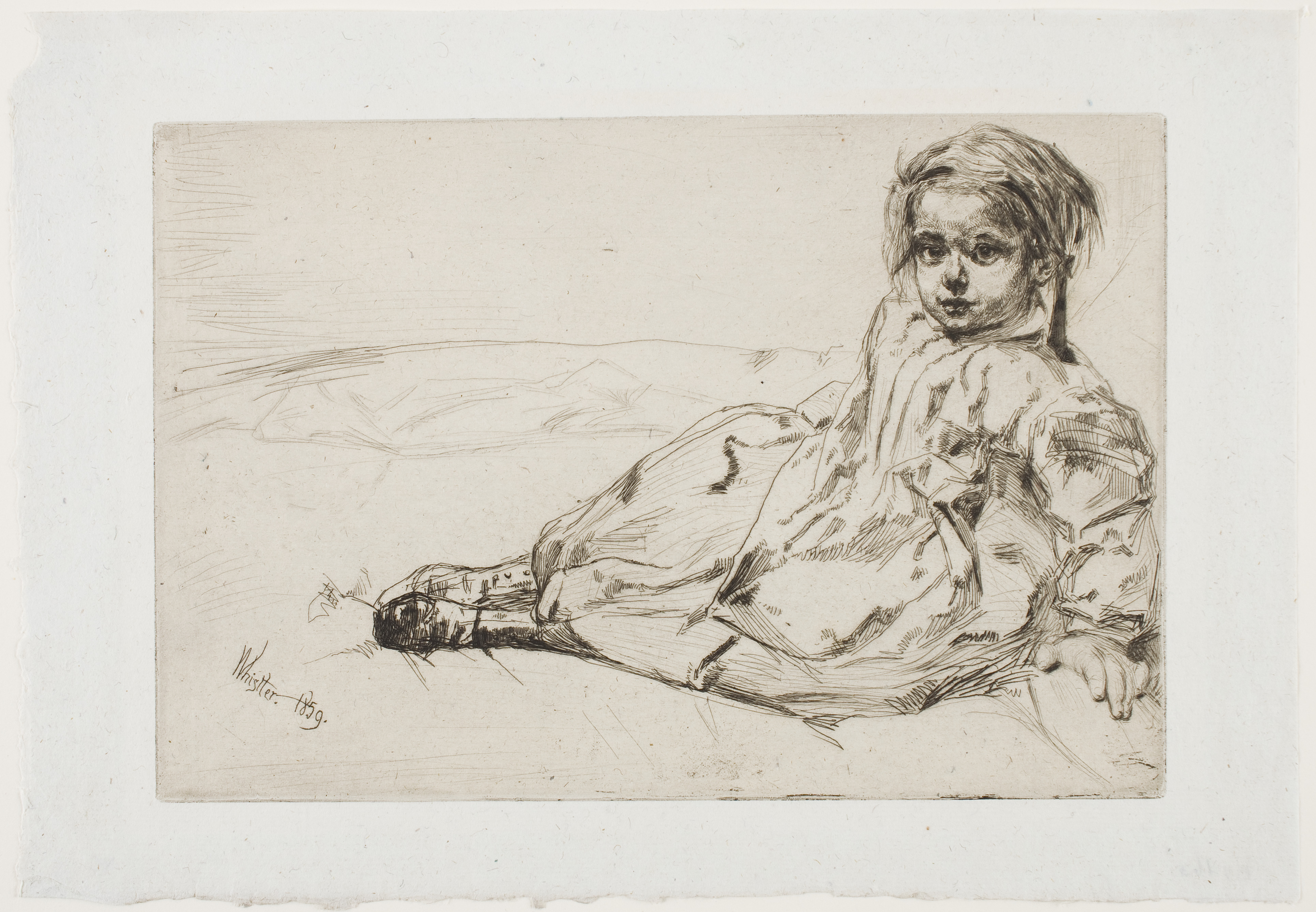 The American expatriate artist James A. McNeill Whistler created this sensitive etching and dry-point image of young Bibi Valentin. She was the daughter of fellow artist Henry Augustin Valentin, who encouraged Whistler’s printmaking activities during his time in Paris. Whistler’s portrait is skillfully composed, from the girl’s fashionable high-necked dress and buttoned boots to her inquisitive, engaging face. Whistler was renowned as one of the greatest printmakers in the 19th century, and his early prints from the 1850s often depict children, such as this example.