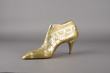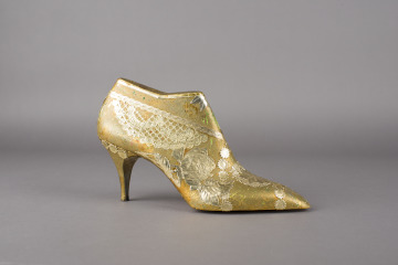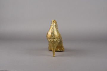 Andy Warhol produced this golden shoe sculpture early in his career when he was working in the world of fashion as a commercial illustrator. The shoe is covered in imitation gold leaf and decorated with a golden doily. Warhol also made related collages of golden shoes, each named after a celebrity such as James Dean, Zsa Zsa Gabor, and Truman Capote. This work already reflects his fascination with popular culture in the mid-1950s before the advent of Pop art in the following decade.